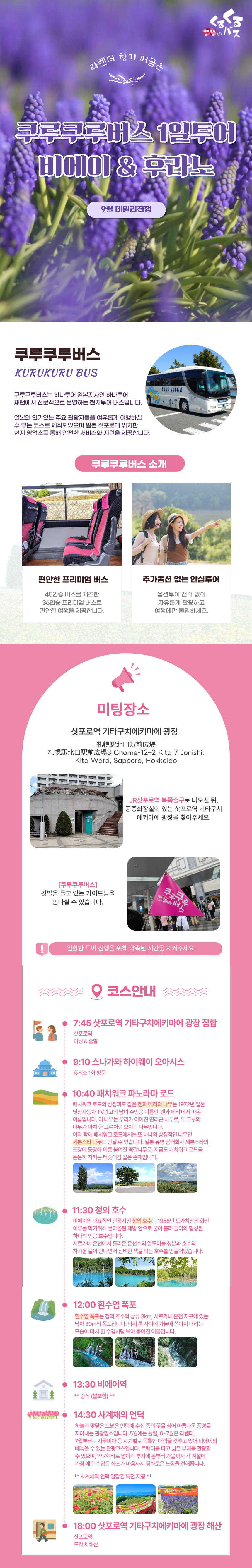 한국인 전용 버스 투어로 안심하고 이용할 수 있는 쿠루쿠루 버스 투어와 함께 여름에 떠나는 비에이 & 후라노 여행을 즐겨보세요! 울창하게 뻗은 대나무숲이 겨울과는 다른 모습으로 비에이와 후라노의 또 다른 매력에 빠지게 될거예요.