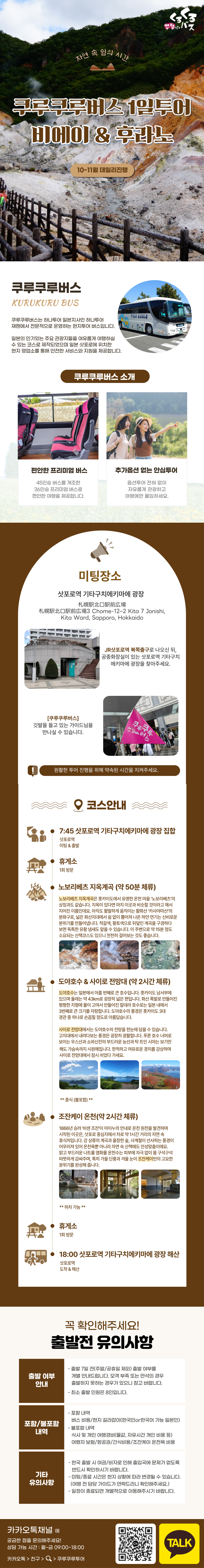 홋카이도에서 어디를 가야 할지 고민이 되는 분, 또는 여행 일정이 넉넉치 않아서 하루 만에 관광지를 클리어 하고 싶은 분들에게 강력하게 추천해 드려요! 홋카이도 일일 투어를 통해 가성비 있는 금액으로 하루 안에 알차게 관광지 전부를 돌아보세요!