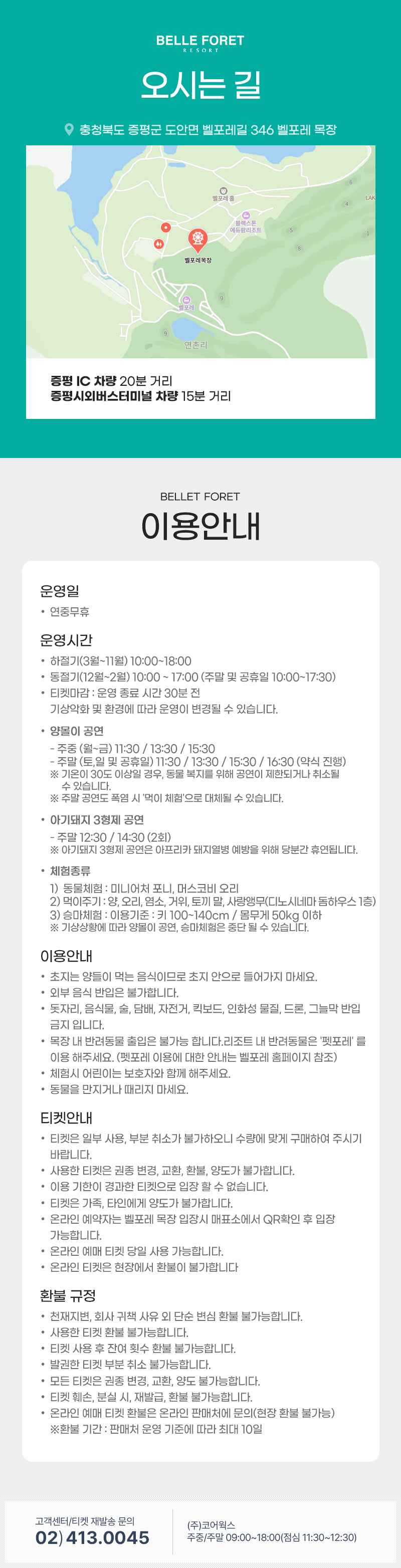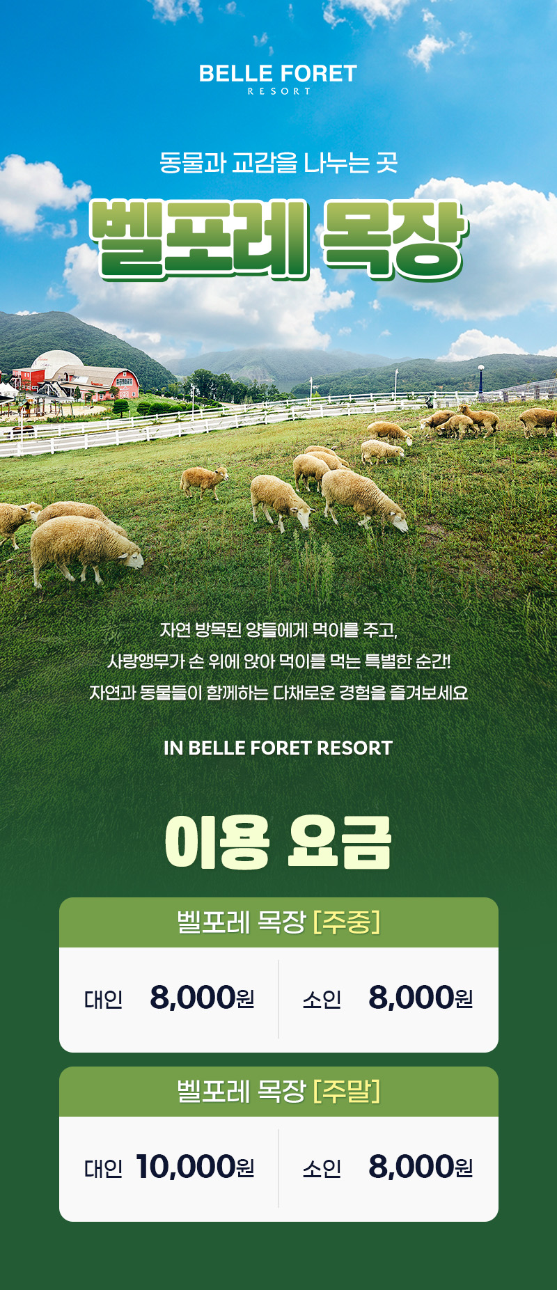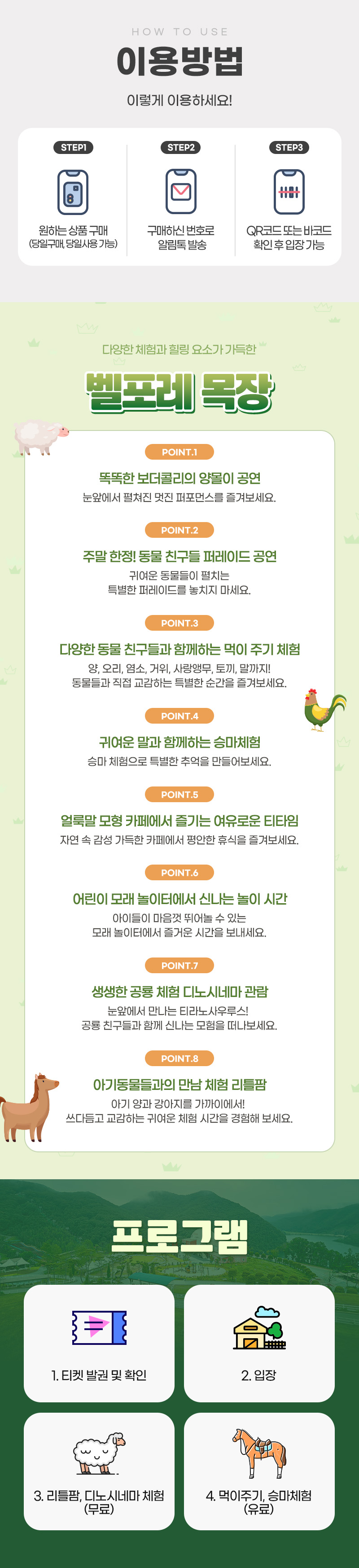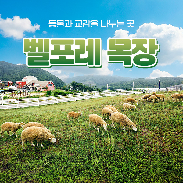 한국어 제공가족, 연인 혹은 친구와의 소중한 충북 여행! 충북 핫플레이스를 방문하고 싶다면 벨포레 목장에 놀러 오세요. 벨포레 목장에선 기니피그, 토끼, 염소, 말 등 다양한 동물들을 만날 수 있고 귀여운 양들을 눈앞에서 볼 수 있는 양몰이 공연, 미니 짚라인을 즐길 수 있는 어린이 놀이터 등 다양한 체험들을 함께 즐길 수 있으니 잊지 못할 추억을 만들어 보세요!