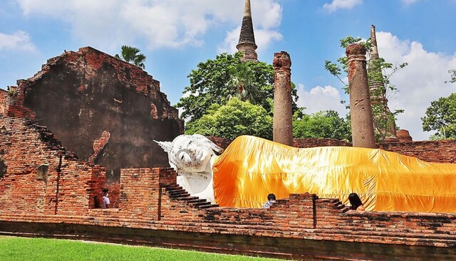 72m 높이의 거대한 황금 불탑과 그 주위를 지키는 수많은 불상군이 압도적인 경관을 자아냅니다. 승리와 번영을 기원하며 세워진 이 사원의 가파른 계단을 올라보세요. 정상에서 바라보는 아유타야의 탁 트인 전경은 도시 전체가 하나의 거대한 유적임을 실감하게 합니다. 불상 앞에 놓인 노란 가사들이 바람에 흩날리는 평화로운 순간을 사진으로 남겨보세요.