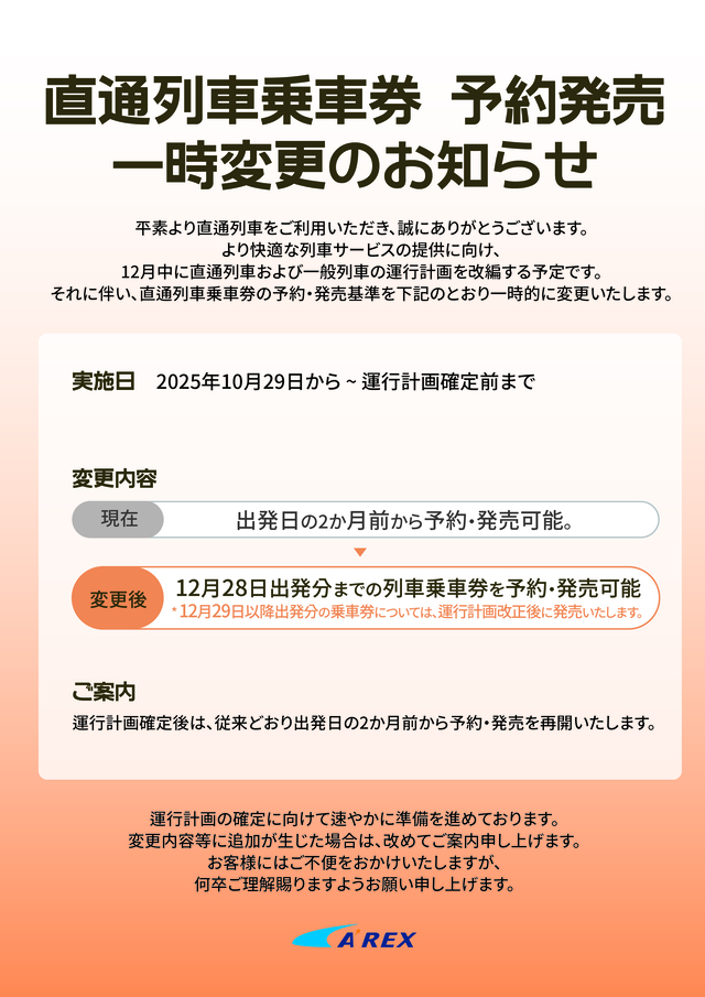 韓国語,日本語🚫 空港鉄道AREXの列車運行スケジュールは、2025年12月29日以降に変更される予定です。 🚫 そのため、運行計画が確定するまで、12月29日以降の乗車券予約は一時的に制限されます。