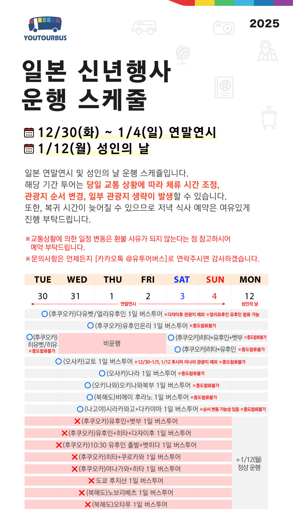 한국어 제공🧡특전1. 유투어버스 단독 이벤트! 유투어버스를 이용하는 고객님께 일본 인기 간식 meiji ALMOND를 선물로 드립니다. (선착순 증정으로 조기 소진될 수 있습니다. 12/20~1/25) 🧡특전2. 가마도지옥 입장권 + 온천달걀 + 사이다 세트 제공! ※일본 연말연시 기간(12/31~1/2)에는 운행하지 않습니다. ※삿포로 맥주공장 혹은 진격의 거인 뮤지엄 중 택1 하여 자유롭게 관람 가능합니다. (단, 삿포로 맥주공장 휴관일에는 진격의 거인 뮤지엄 관람이 불가합니다.)