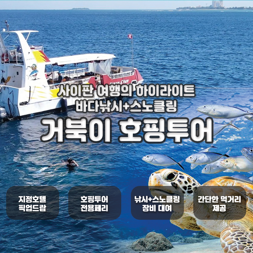 아름다운 섬을 배경으로 오션스타 보트, 낚시, 스노클링을 한번에 즐길 수 있는 호핑 투어와 함께 잊을 수 없는 추억을 남겨보세요. 직접 잡은 물고기로 손맛도 느끼고 회와 음료를 먹으며 사이판 바다 한가운데에서 여유를 한껏 즐겨보세요. 선택에 따라 마나가하섬 입도 및 하늘 위에서 에메랄드 빛 바다를 감상할 수 있는 패러세일링까지 가능하답니다.