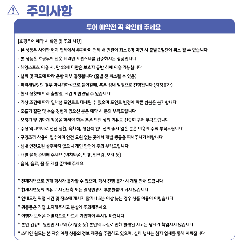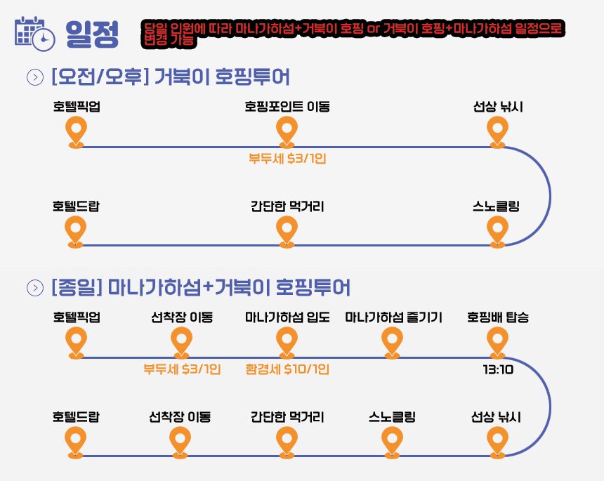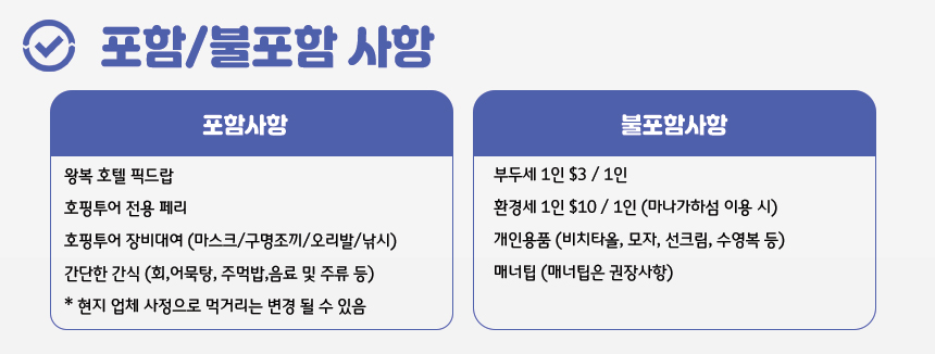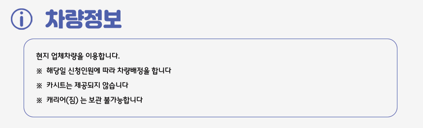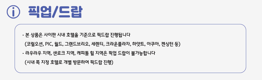 * 사이판 시내 호텔을 기준으로 픽드랍 진행됩니다. (라오라오, 샌로크, 캐피톨 힐 지역 픽업/드랍 불가)
