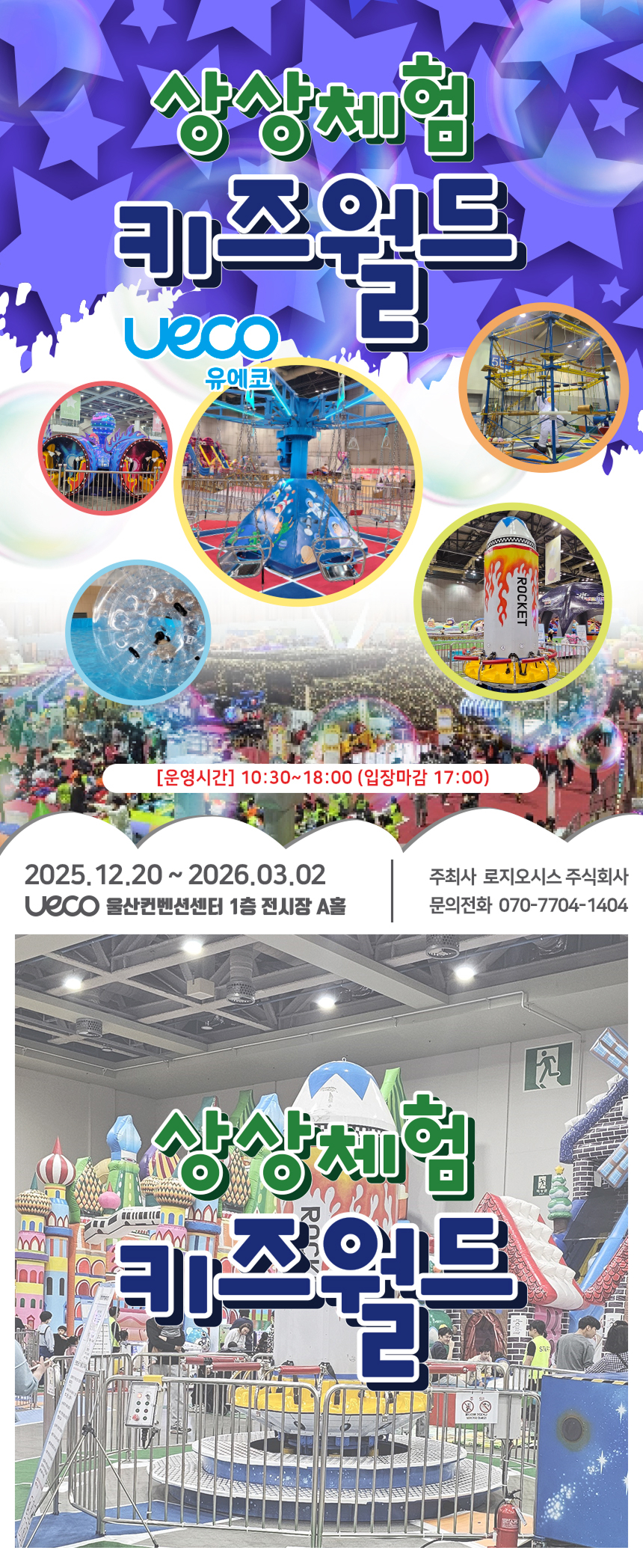 온 가족이 함께 즐길 수 있는 테마파크! 울산 유에코 키즈월드는 다양한 테마의 놀이기구와 대규모의 키즈카페가 준비되어 있어요. 초대형 에어바운스부터 회전목마, 바이킹, 바퀴 썰매까지! 아이들에게 인기 만점인 놀이기구를 즐겨보세요.
