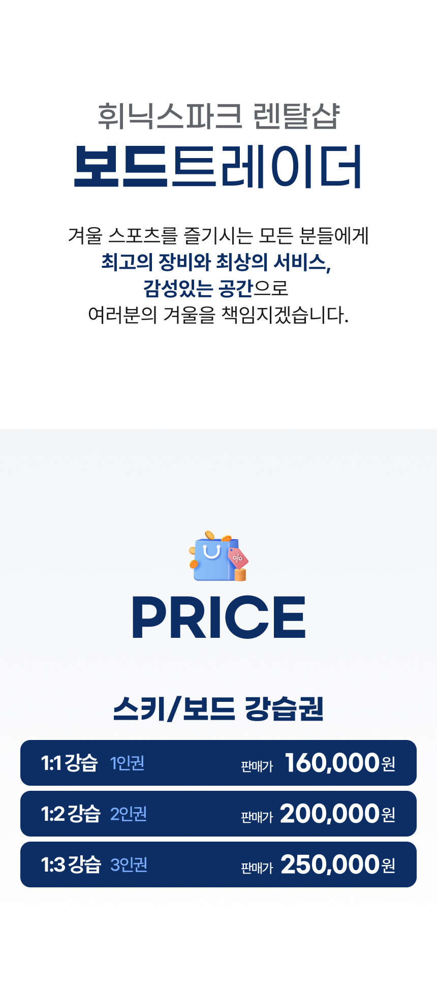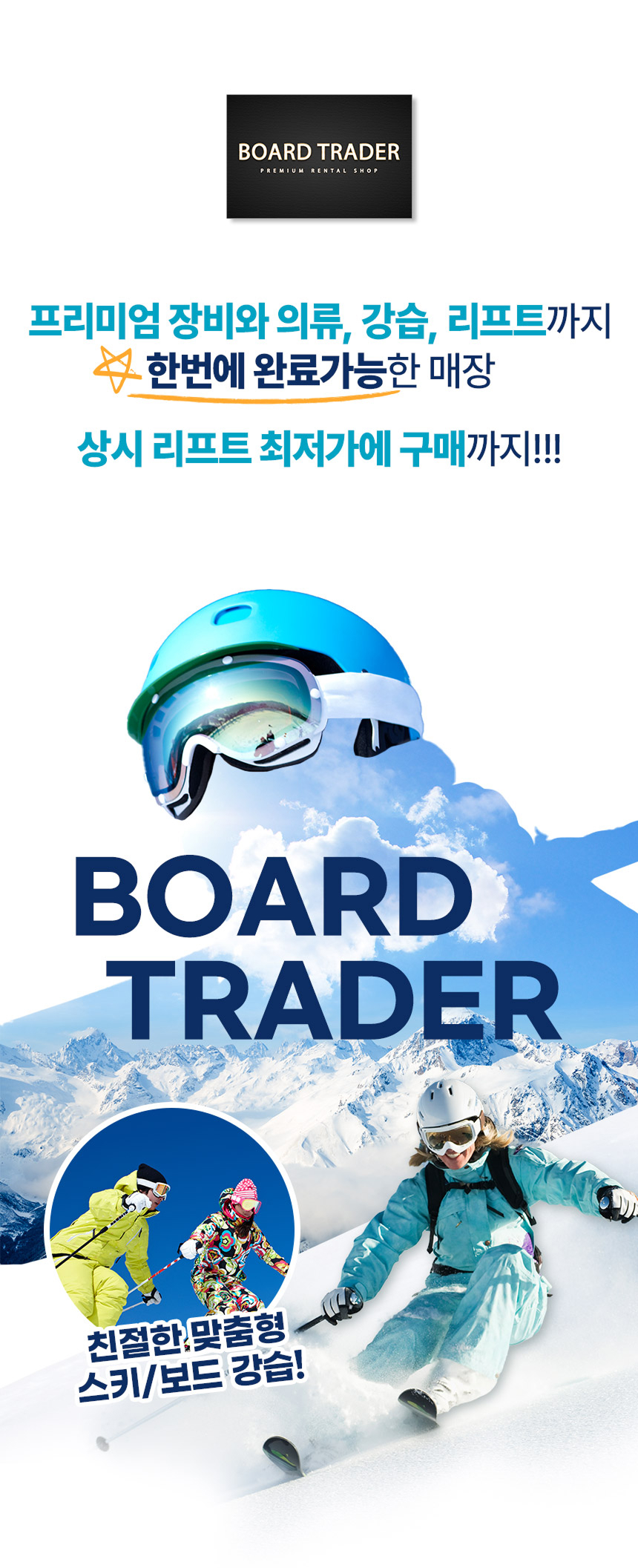 보드트레이더는 국내 최초의 프리미엄 프랜차이즈 렌탈샵으로 프리미엄 장비와 의류, 강습까지 한 번에 완료할 수 있는 곳이에요. 겨울 스포츠를 즐기시는 모든 분에게 최고의 장비와 최상의 서비스, 감성 있는 공간으로 여러분의 겨울을 책임질게요. 전문적인 강습을 받으며 이번 겨울 스키와 보드를 더욱 알차게 즐겨 보세요!