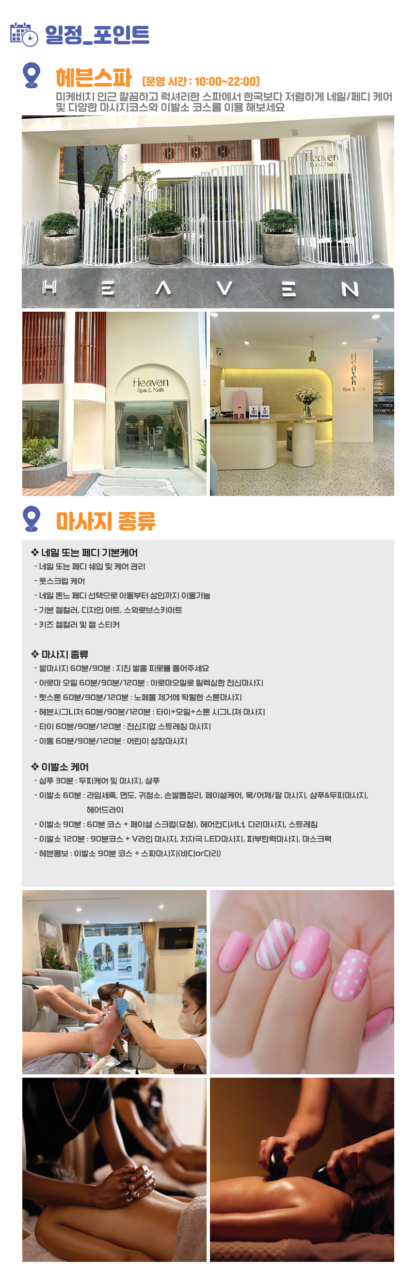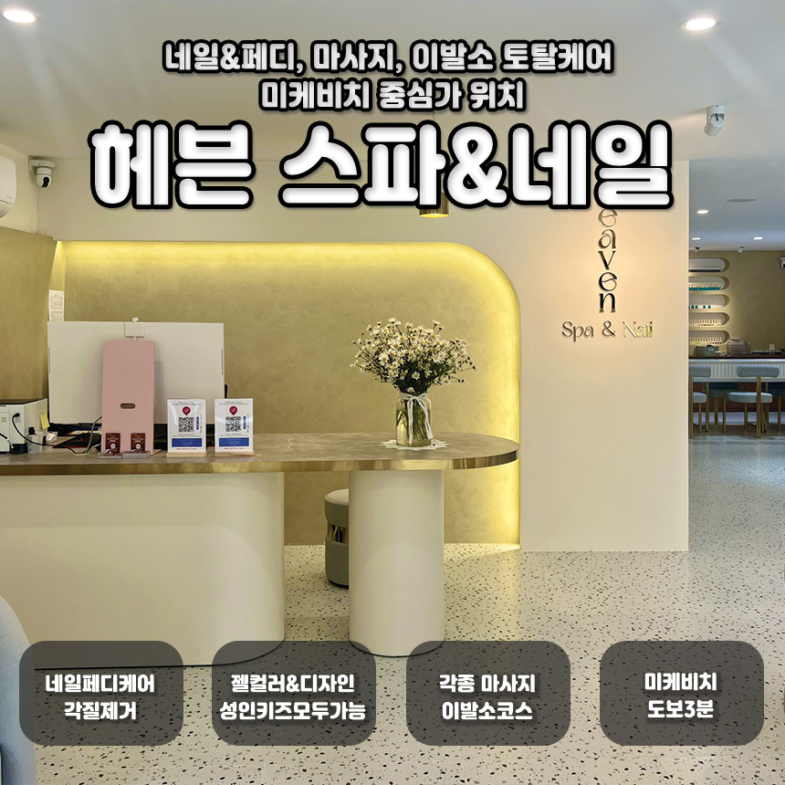 헤븐 스파 & 네일은 마사지와 네일/패디 케어 및 아트를 모두 제공하는 스파예요. 아침 9시부터 저녁 11시까지 운영하여 일정을 세우기에도 문제없고, 편하게 이용할 수 있는 샤워시설과 마당 및 테라스, 1~3층 휴식공간까지 완비되어 있어서 힐링을 찾는 여러분에게는 더할 나위 없답니다. 세련된 인테리어와 질 높은 서비스까지, 부담 없이 즐겨보세요!