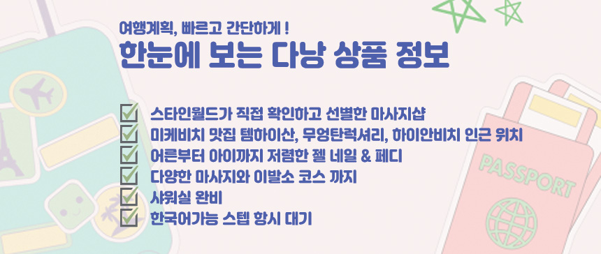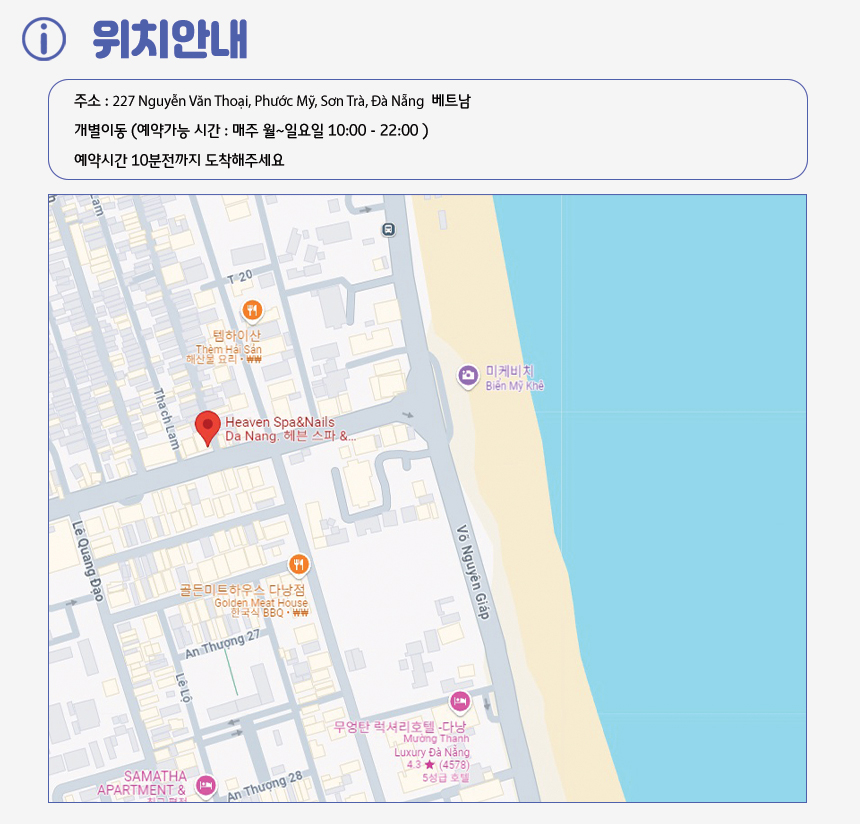 다낭 여행에서의 스파, 탁월한 실력과 착한 가격으로 필수 코스나 다름없죠. 아직 어떤 스파를 방문할지 정하지 못하셨다면, 미케비치 도보 1분 이내 거리에 있는 '헤븐 스파 & 네일'은 어떠신가요? 휴식을 위한 최적의 공간, 헤븐 스파로 여러분을 초대해요!