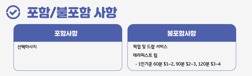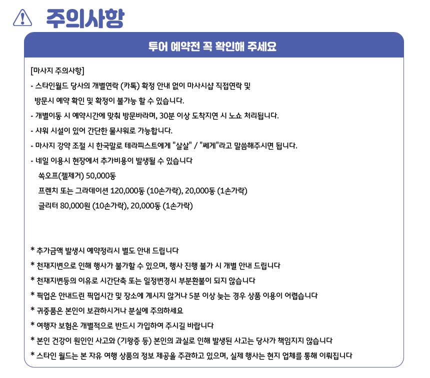 * 지각 시 스파 프로그램 이용 시간이 줄어들거나 노쇼 처리 될 수 있으며, 이로 인한 환불은 불가합니다.