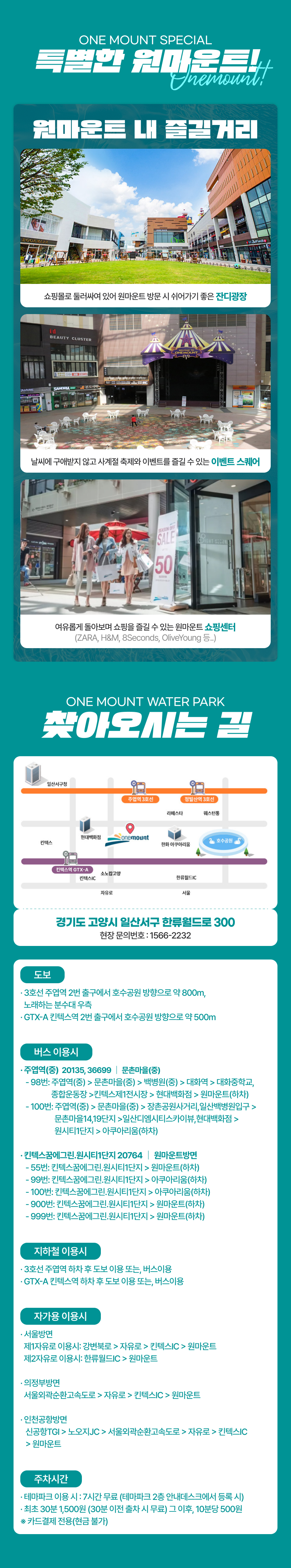 한국어 제공모험심을 자극하는 짜릿한 슬라이드! 파도풀, 유수풀 등 도심에서 즐기는 최고의 어트랙션이 준비된 원마운트 워터파크를 방문하세요. 실내존에는 300m 길이의 해저탐험 유수풀과 원심력을 견디는 스릴만점 킹볼라이드가 준비되어 있어요. 초고속 스피드를 느낄 수 있는 스피드뱅도 즐겨보세요!
