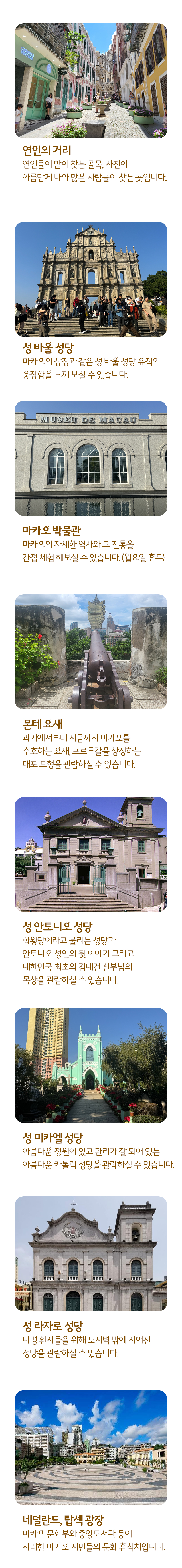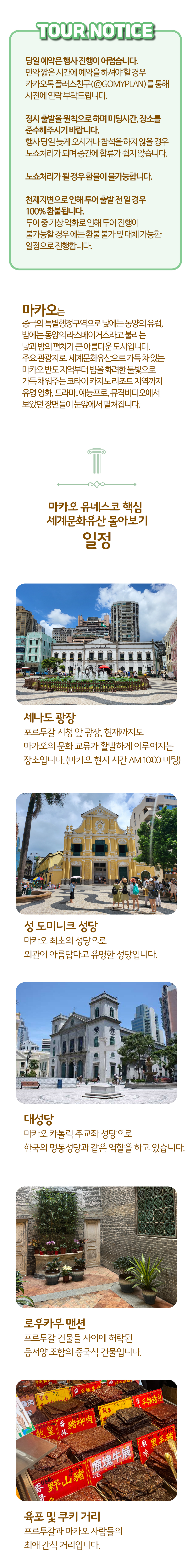 이번 투어는 마카오의 화려한 겉모습이 아닌, 그 내면에 깊이 박힌 역사적 서사를 따라가는 여정입니다. 거친 돌길 위에 새겨진 세월의 흔적을 밟으며, 동서양이 조화롭게 공존하는 독특한 공기의 질감을 오감으로 느껴보세요. 단순히 관광지를 '보는' 것을 넘어, 도시가 들려주는 오래된 이야기에 귀를 기울이는 마법 같은 아침이 시작됩니다.