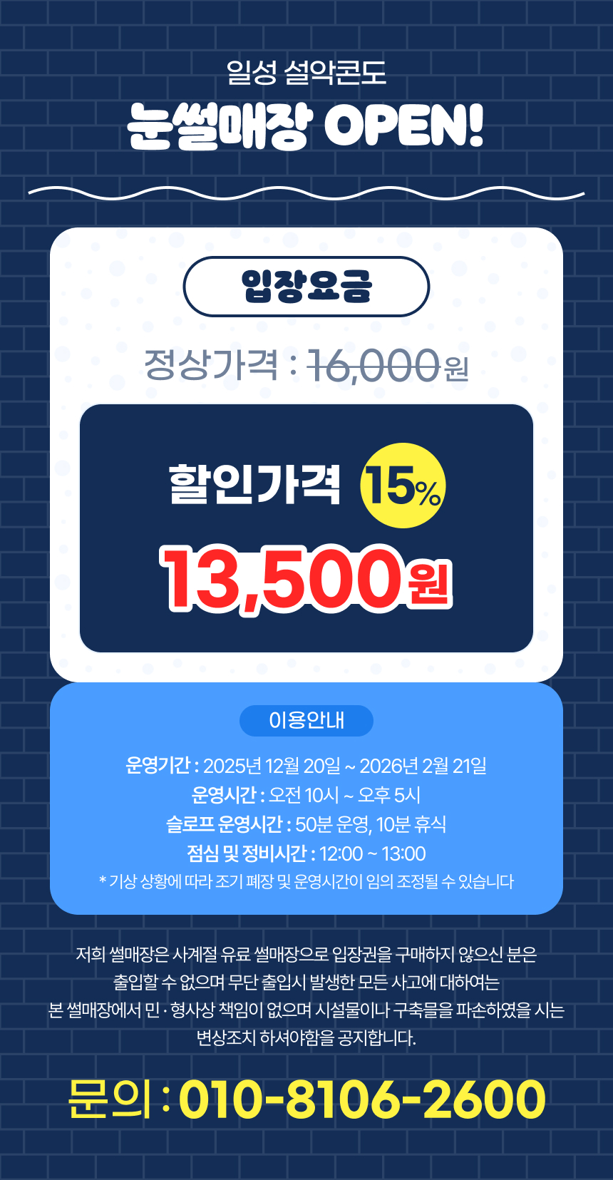 강원도 설악 눈썰매장은 산으로 둘러싸여 아름다운 자연경관을 자랑해요. 멋진 뷰를 보며 빠른 속도로 달리는 눈썰매를 타다 보면 시간 가는 줄 모를 거예요. 온 가족이 다함께 즐길 수 있는 일성 콘도 설악의 눈썰매장이 이번 겨울을 더욱 풍성하게 만들어 줘요. 지금 바로 와그에서 설악 눈썰매장 입장권을 합리적인 가격에 만나보세요!