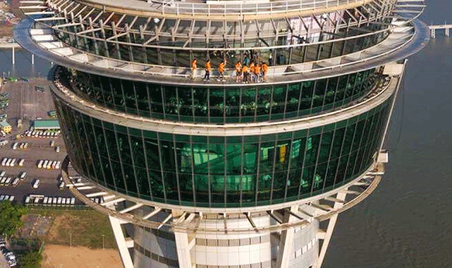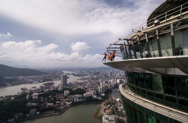 마카오 타워 전망대 바깥, 233m 높이의 난간을 걷는 짜릿한 경험을 즐겨보세요.