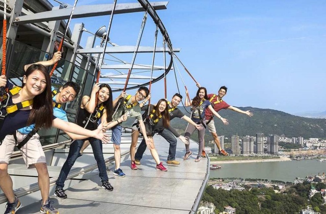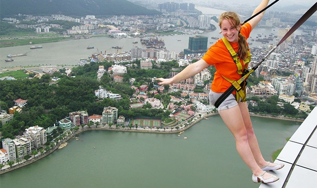 스카이점프는 일반적인 번지점프와는 다른 독특한 매력을 지니고 있다는 사실! 서 있는 자세 그대로 로프에 의존해 부드럽게 아래로 떨어지는 방식이에요. 일반적인 번지점프의 소요 시간은 단 4 - 6초라면 스카이점프의 소요시간은 17초! 빠른 속도감과 함께 마카오의 전경을 즐기기에 충분해요.
