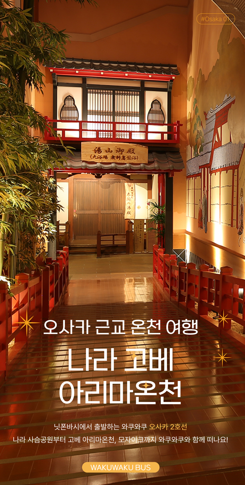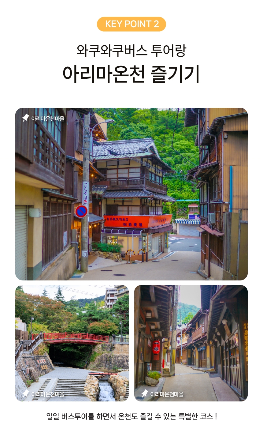 교토는 조금 식상하고, 더 색다른 걸 원하신다고요? 그런 분들에게 와쿠와쿠버스의 오사카 2호선 투어를 추천해요. 나라&고베의 핫플레이스는 물론, 대중교통으로 가기 힘든 3대 온천 '아리마 온천' 입장 특전까지! 알찬 투어구성에 관광지마다 체류 시간이 넉넉해서 여유롭게 투어를 즐기실 수 있어요.
