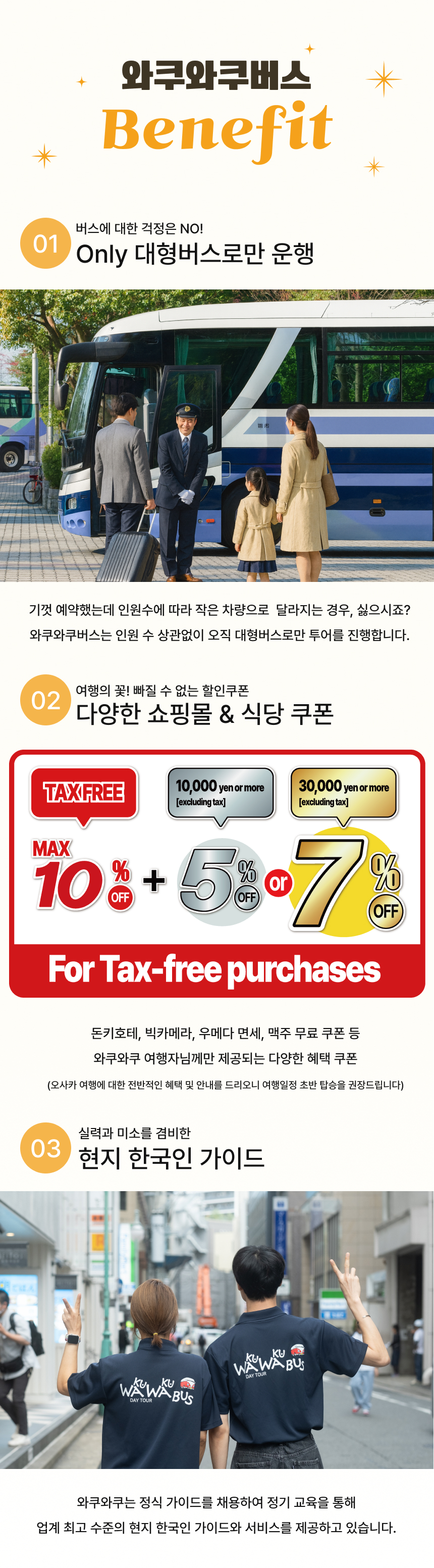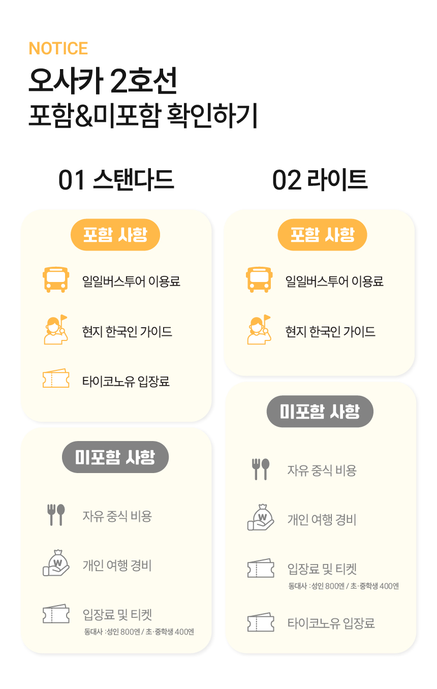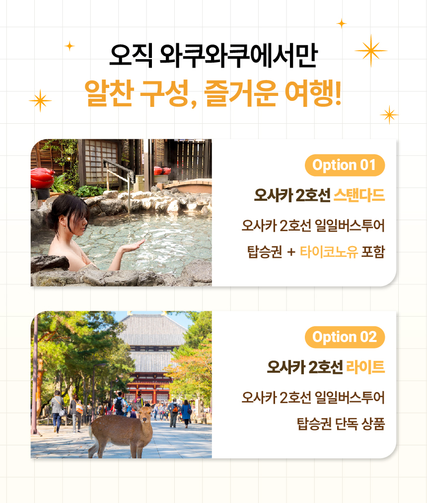 ✨타이코노유 온천 입장권은 스탠다드 옵션에만 포함되어 있으며, 라이트 옵션에는 불포함입니다. 🚌신나게 떠나는 와쿠와쿠 버스 투어🚌 버스를 타고 즐겁게 힐링하는 와쿠와쿠 버스투어 ❤️와쿠와쿠버스에서만 드리는 혜택❤️ ✨인원 수에 따른 버스변경 NO! 오로지 대형버스로만 운행✨ ✨여행 중 지루할 틈 없는 와쿠와쿠 365 퀴즈 이벤트 진행✨ ✨재방문 여행자님께 드리는 소소하지만 정성 가득한 지역 특산 선물✨ ✨특별 제작한 QR 여행지도 & 돈키호테 할인 쿠폰 제공✨ 설렘 가득한 오사카 여행을 와쿠와쿠버스와 함께 떠나보세요!