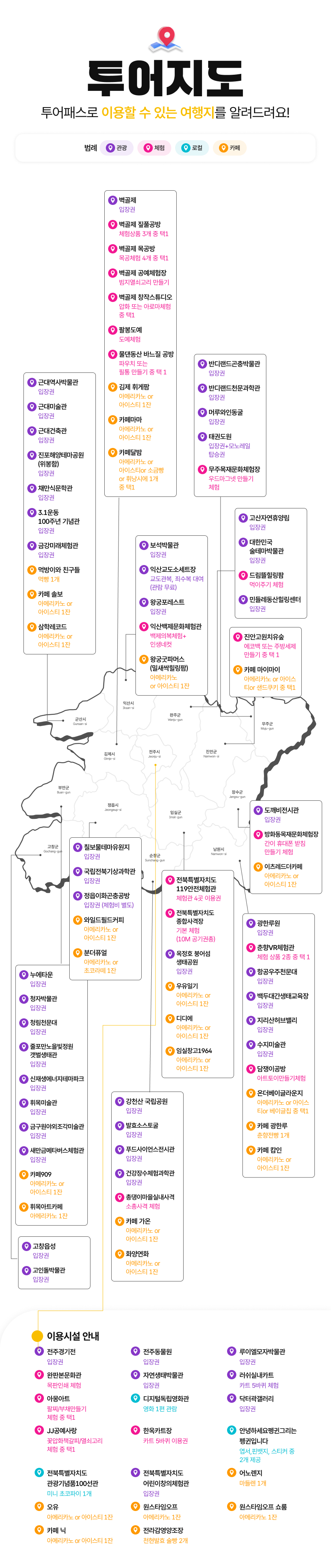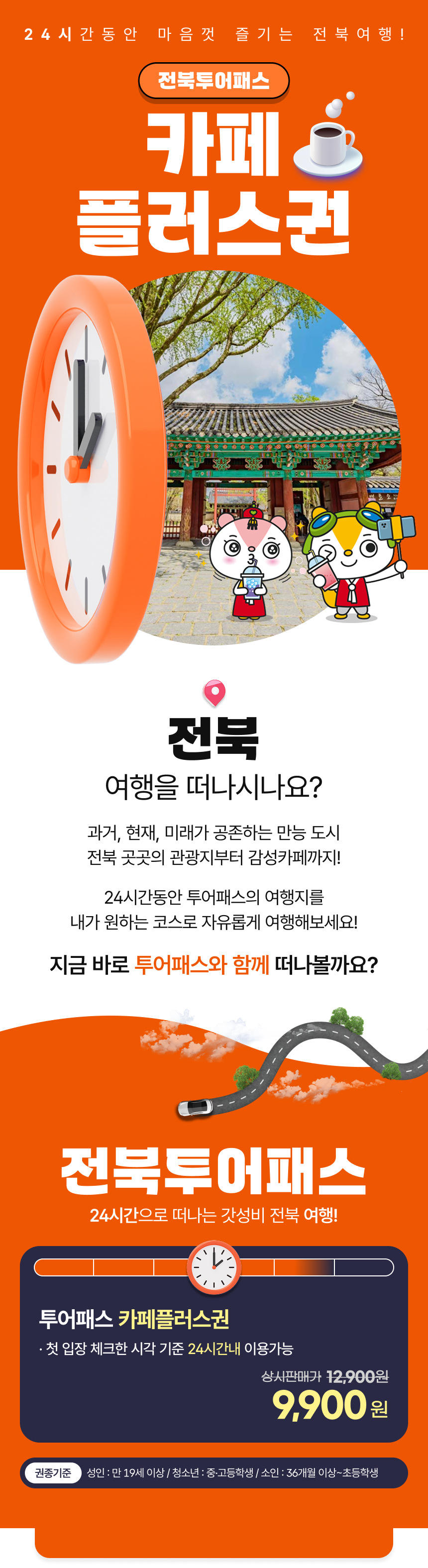 전북의 다양한 관광지뿐만 아니라 카페까지 프리패스할 수 있는 전북투어패스 플러스권을 소개할게요. 플러스권과 함께라면 여행 필수코스인 관광지와 체험시설, 전시, 그리고 플러스권만의 혜택, 분위기 있는 카페에서의 향긋한 커피까지 무료로 즐길 수 있어요. 24시간 동안 무제한으로 다양한 관광지를 여행하고 커피 한잔의 여유까지, 완벽한 여행을 만들어 보세요. 합리적인 가격으로 전북 여행을 떠나는 최고의 방법, 오픈특가로 진행되는 전북투어패스 플러스권과 함께하세요.