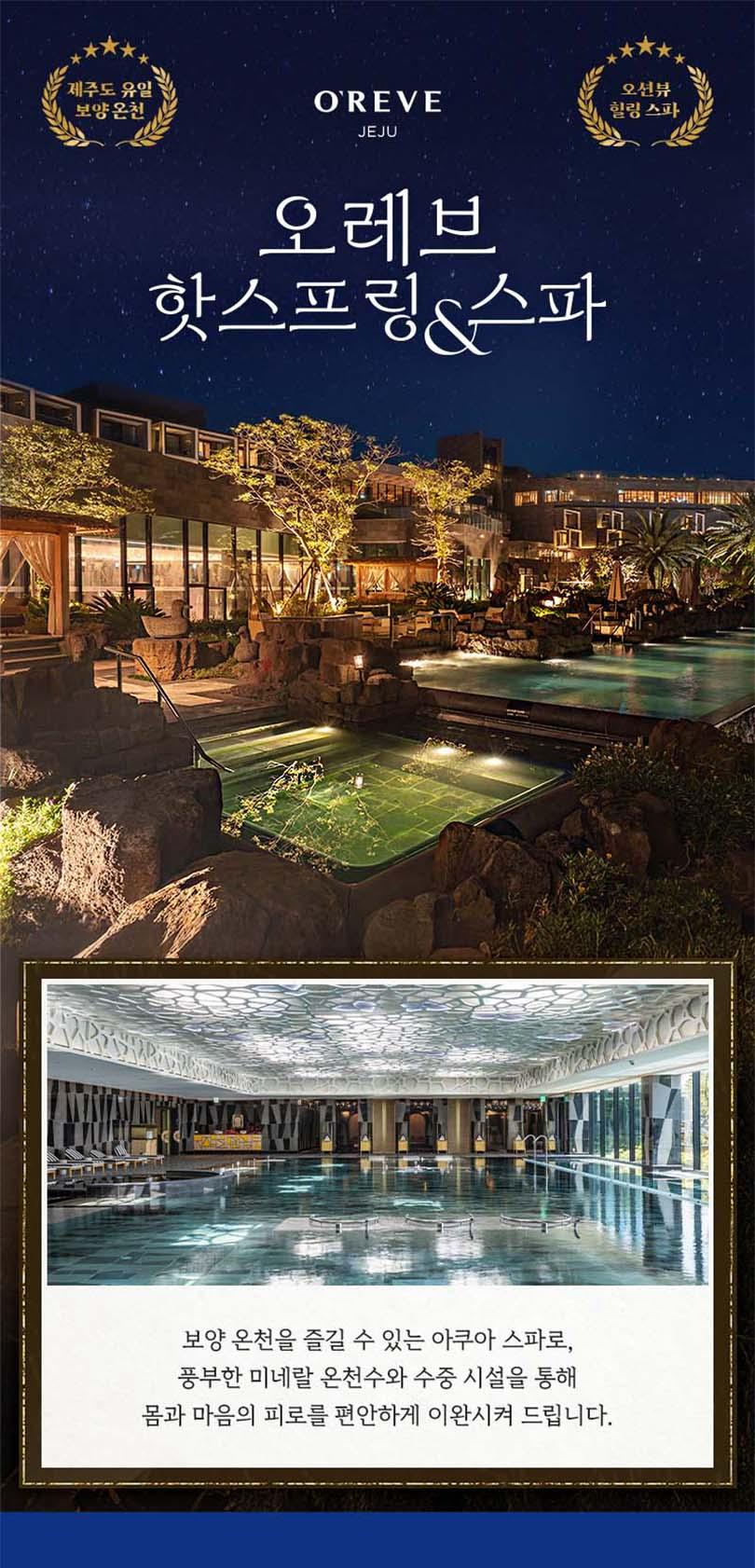 오레브는 지하 2,008M로 국내 가장 깊은 온천이자 제주 유일의 국민 보양온천으로, 천혜 환경에 둘러싸여 최고의 휴식을 누릴 수 있는 웰빙 공간이에요. 인도어풀과 아웃도어 스파로 이루어진 아쿠아스파에서 경험하는 탄산온천과 다양한 테마의 찜질스파는 오레브에서만 누릴 수 있는 특별한 공간이니, 제주의 아름다운 자연을 만끽하며 피로와 스트레스를 풀어보세요.🌿🛁