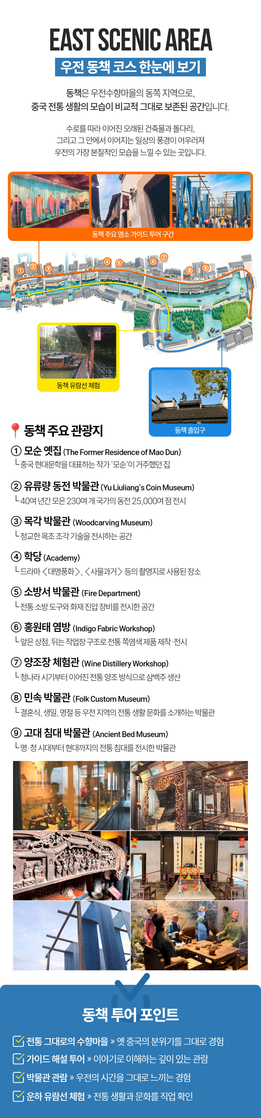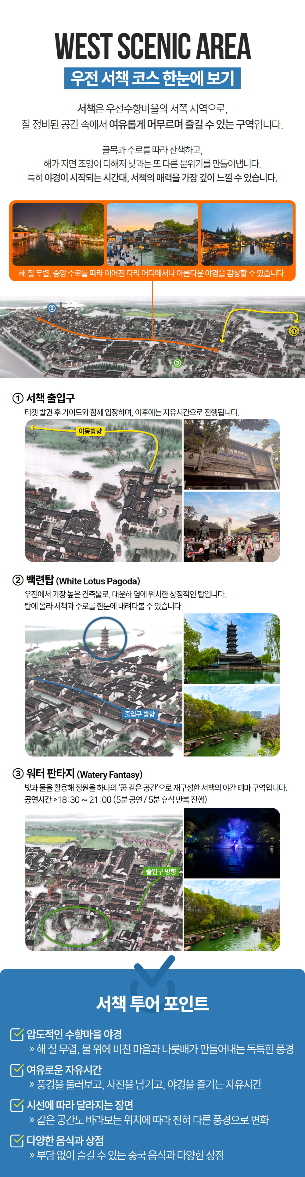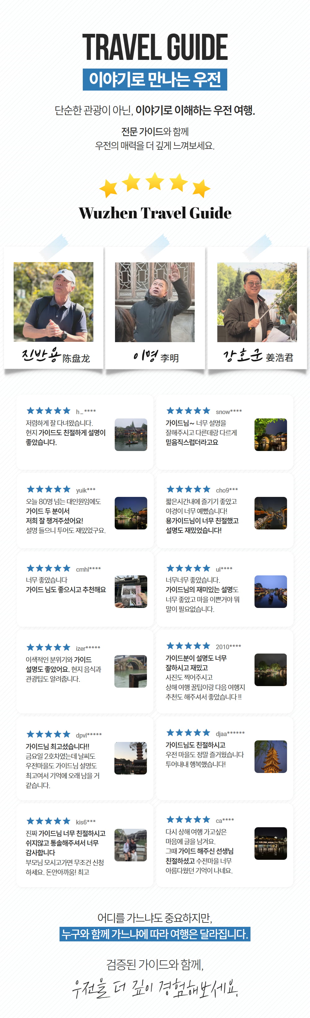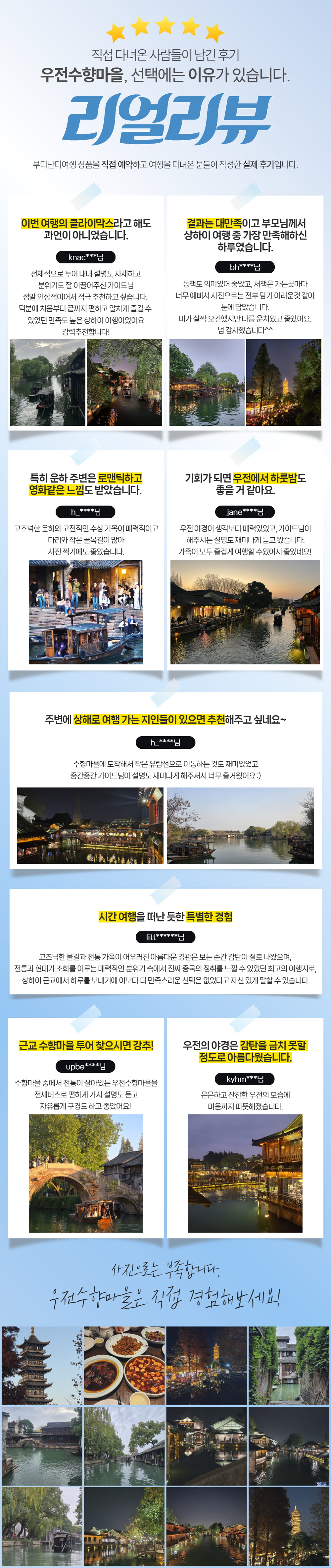 우전수향마을 야간투어는 한국인 가이드님과 함께 투어를 진행하기 때문에 더욱 상세한 해설과 함께 상하이를 둘러볼 수 있으며, 타 투어와 다르게 노팁, 노쇼핑, 노옵션으로 온전히 투어만을 즐길 수 있게끔 구성한 알찬 투어예요. 자 그럼 이제 아름다운 상하이의 야경을 감상하러 여행을 떠나볼까요?