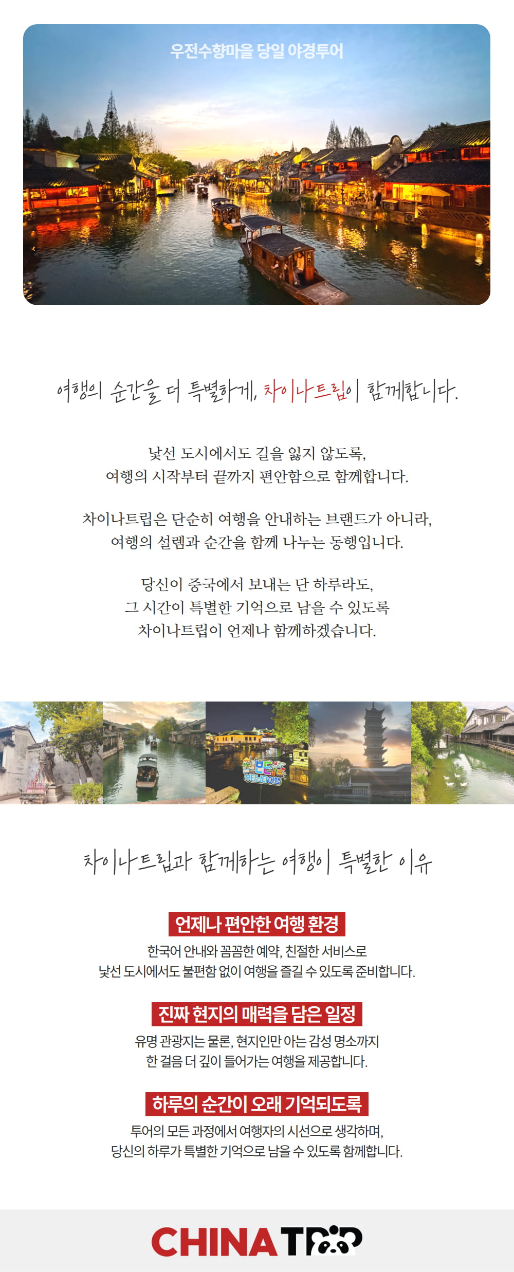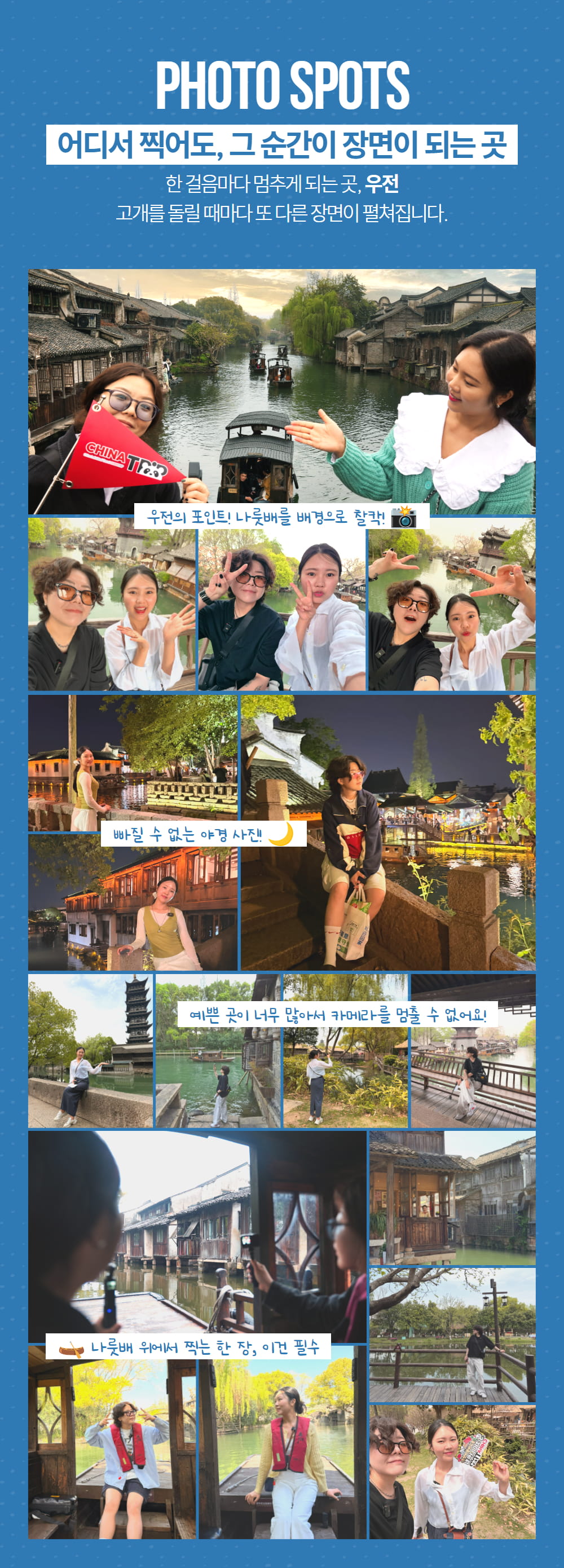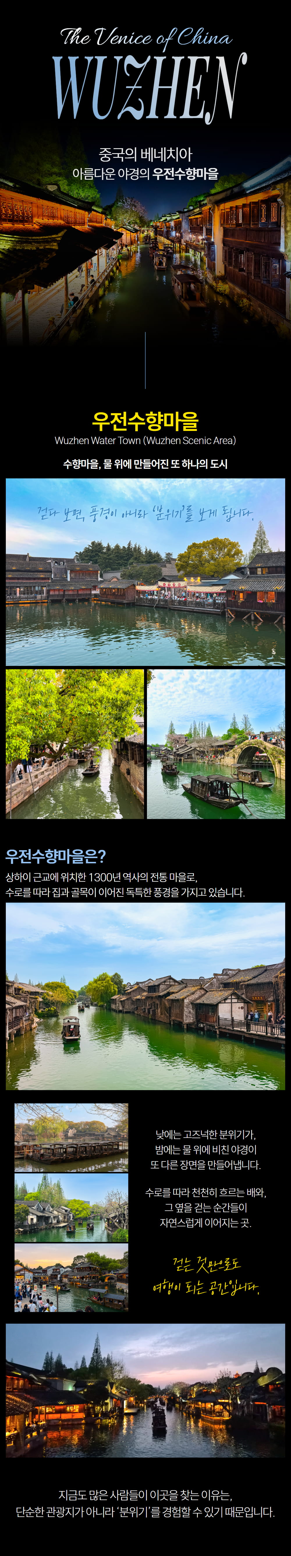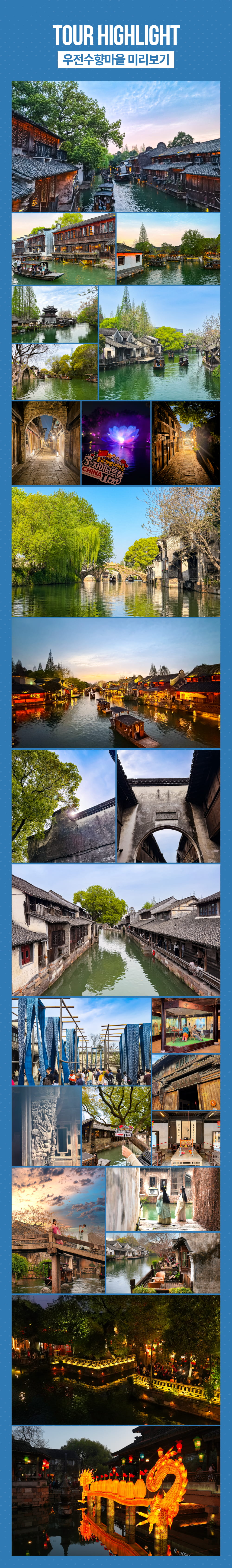 주말 또는 짧은 연차와 함께 떠날 수 있는 해외 여행지를 찾고 있었다면 상하이로 떠나보는 건 어때요? 단 한 번의 예약으로 중국의 베네치아인 우전수향마을에서 빛나는 야경을 만날 수 있어요. 게다가 투어에 포함되어 있는 동책 유람선을 탑승해 여러분에게 각각 다른 매력의 야경을 보여줄 거예요.