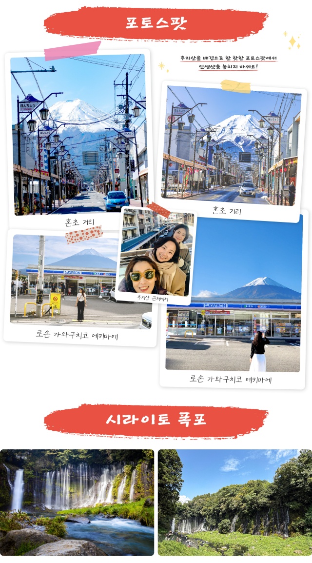 도쿄의 번잡함에서 벗어나 자연의 화려함과 문화적 깊이를 엮어내는 후지산 투어는 어떠신가요? 요즘 SNS에서 급부상 중인 후지산 인증샷 스팟인 오부치 사사바, 혼코거리부터 후지산 경치를 제대로 감상할 수 있는 가와구치호, 오이시 공원, 센겐공원까지 모두 커버 가능한 투어예요.