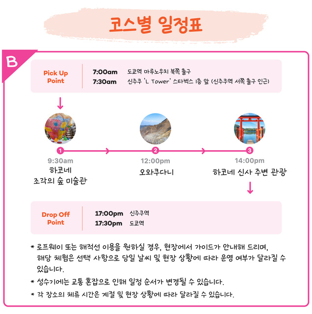 도쿄에서 출발하여 하코네의 아름다운 풍경과 문화적 명소를 만나러 떠나는 투어를 소개해요! 아름다운 후지산도 만날 수 있으니, 기대 가득 하셔도 좋아요. 오와쿠다니로 올라 온천 김이 피어오르는 화산 계곡과 자연 경관이 어우러진 멋진 풍경을 감상하며 여유를 만끽해 보세요. 이후에는 유서 깊은 신사인 하코네 신사도 구경하는 시간을 가질 수 있어요! 자연 속에서 예술 작품을 감상할 수 있는 하코네 야외 조각의 숲 미술관도 방문하니 자연과 예술, 모험이 모두 어우러진 투어로 잊지 못할 하루를 완성해 보세요.