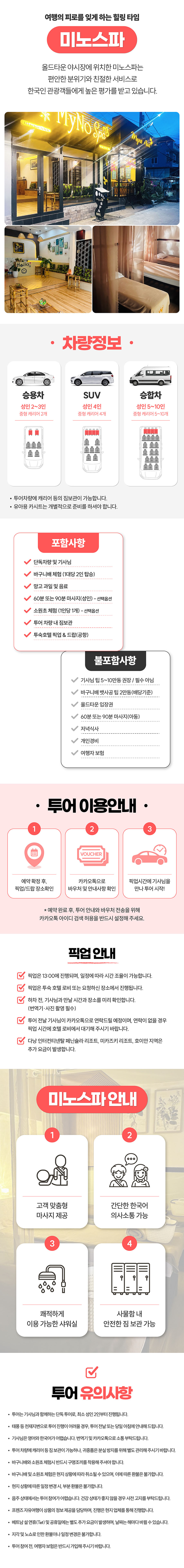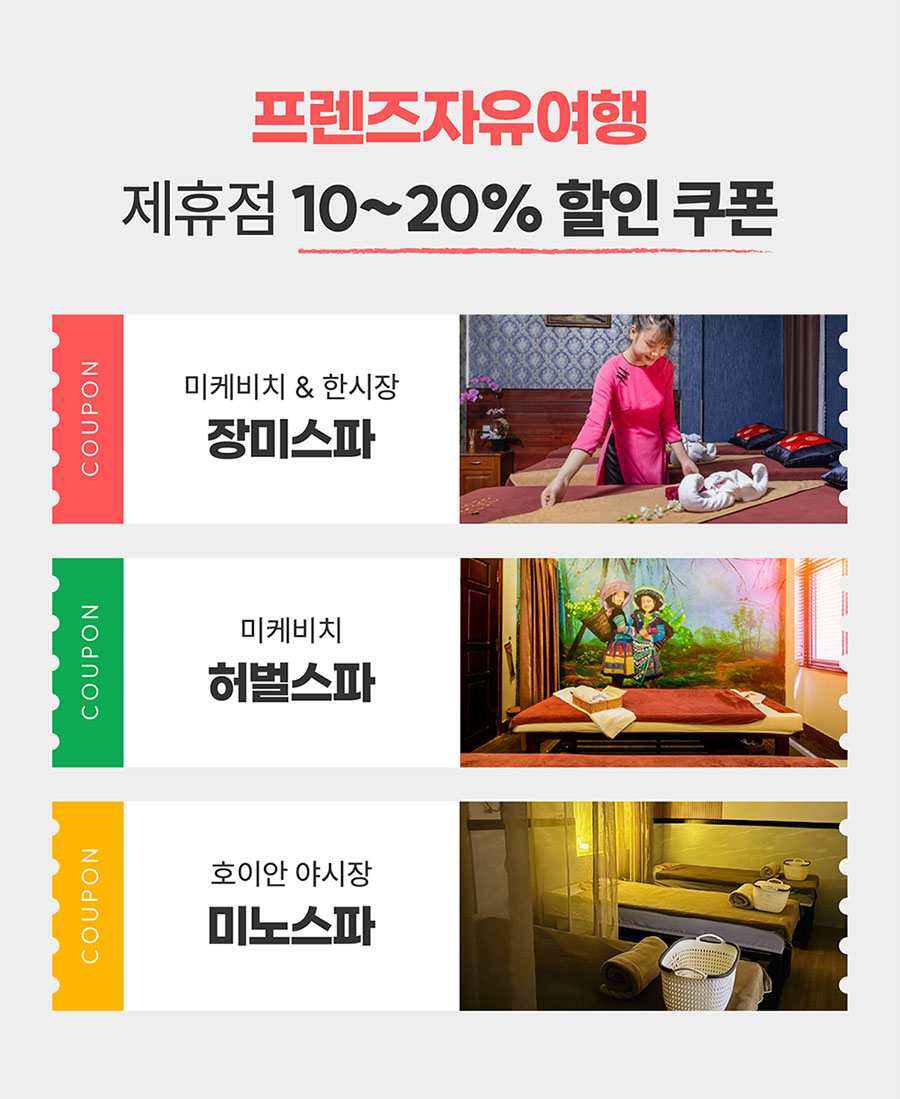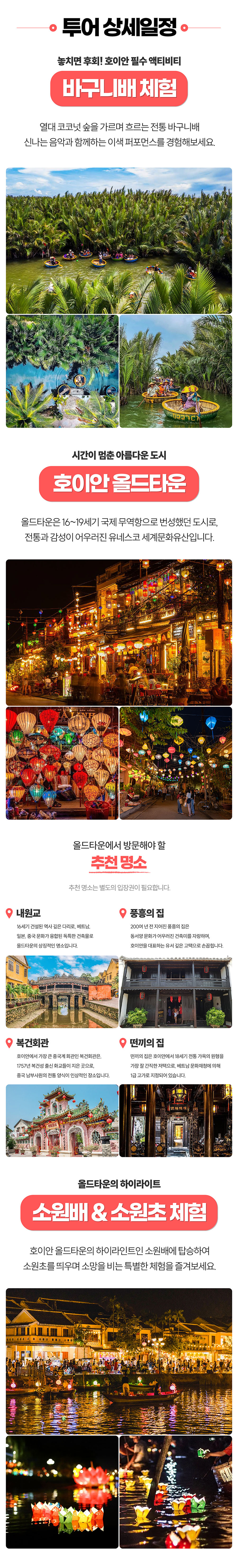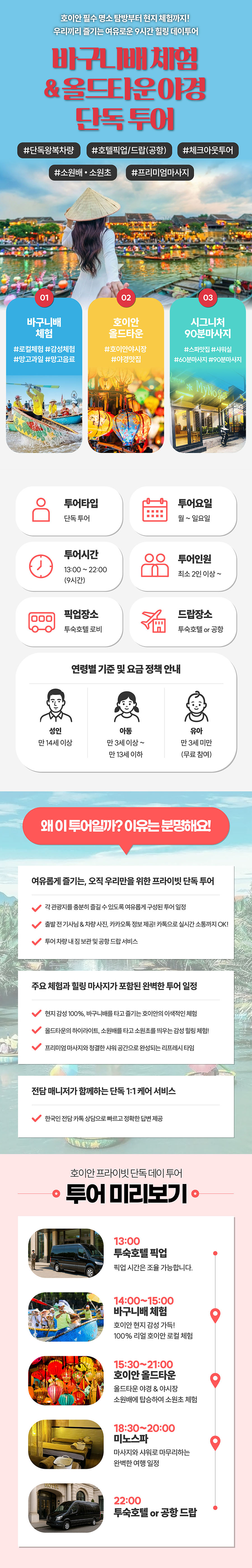 베스트결제하고 조금 걱정했어요 ㅎㅎㅎ 근데 다녀와보니 여행 중 하루를 알차고 뜻깊게 잘 보내게 됐네요. 호이안 투어를 부모님과 같이하시는 분들은 후회 안하실 거예요 먼저 카톡으로 관련 안내를 다 해주시고, 당일에 이슈가 있었는데 기사님이랑 잘 조율해주셨어요 저희만 차타고 편하게 왔다갔다 했고 차도 좋았어요 👍👍 코코넛 보트 타고 공연도 보고 끝나고 나면 망고도 먹고 올드타운 가서 스파받고 야경도 보고 배 타고 소원초 붙여요 야경보면서 배타는게 진짜😆 프로모션된 스파라서 기대없었는데 엄마께서는 베트남 최고의 마사지였다고 하네요~진짜 돈이 하나도 안아깝고 너무 좋았습니다!!