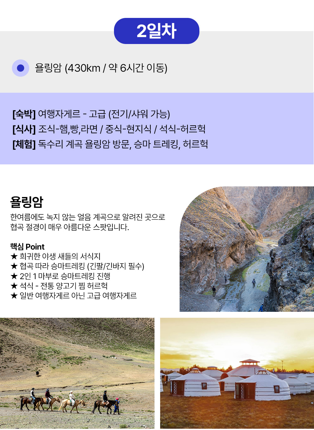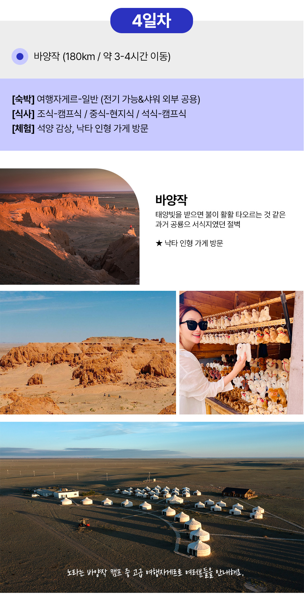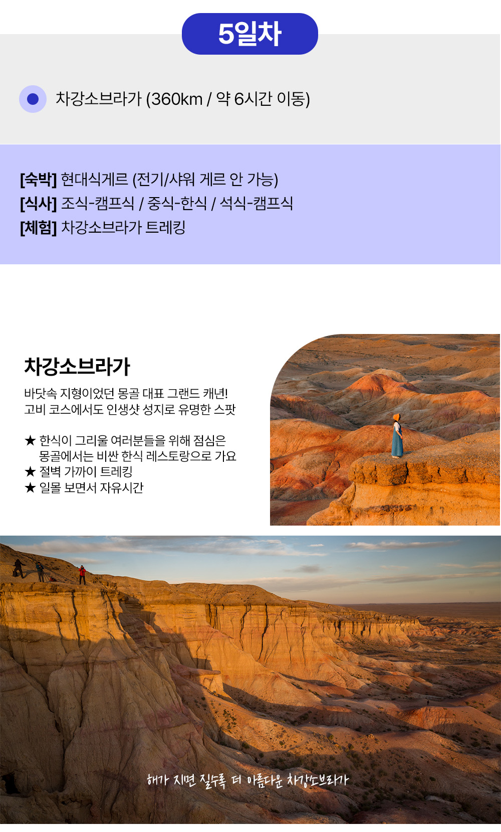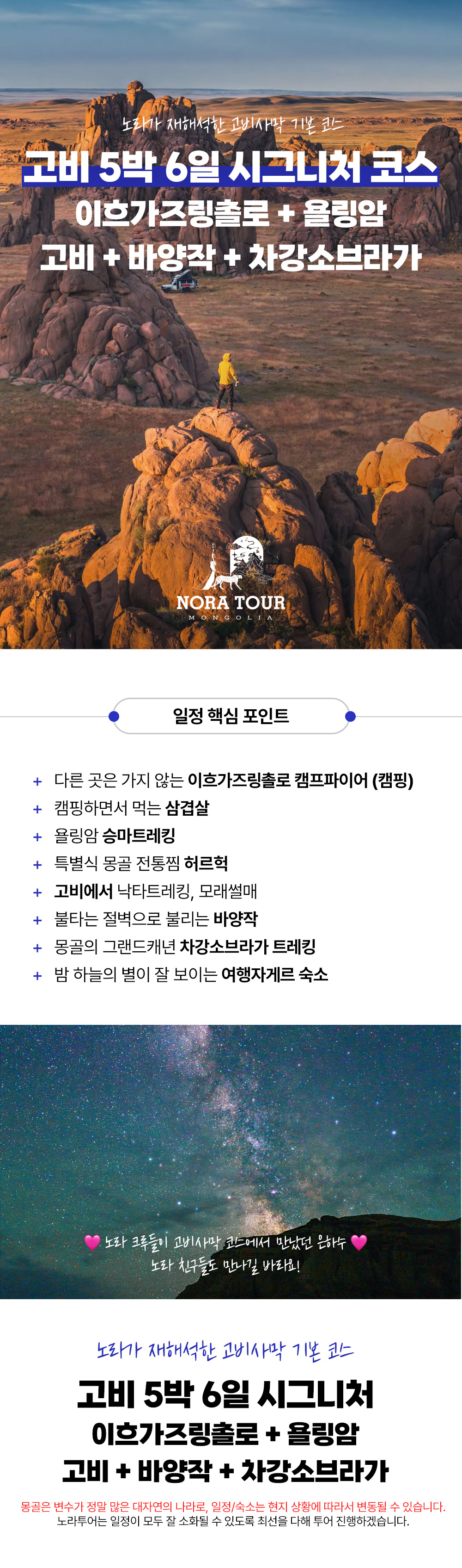 은하수 보며 야영 캠핑을 즐기고, 낙타를 타고, 승마 트래킹을 경험해보고, 모래썰매 몽골의 그랜드 캐년 트래킹 그리고 불타오르는 절벽 석양 아래에서 인생 사진과 삼겹살 파티까지. 5박6일 동안 몽골을 제대로 만나는 투어예요. 몽골 여행은 이 투어 하나면 끝이에요.