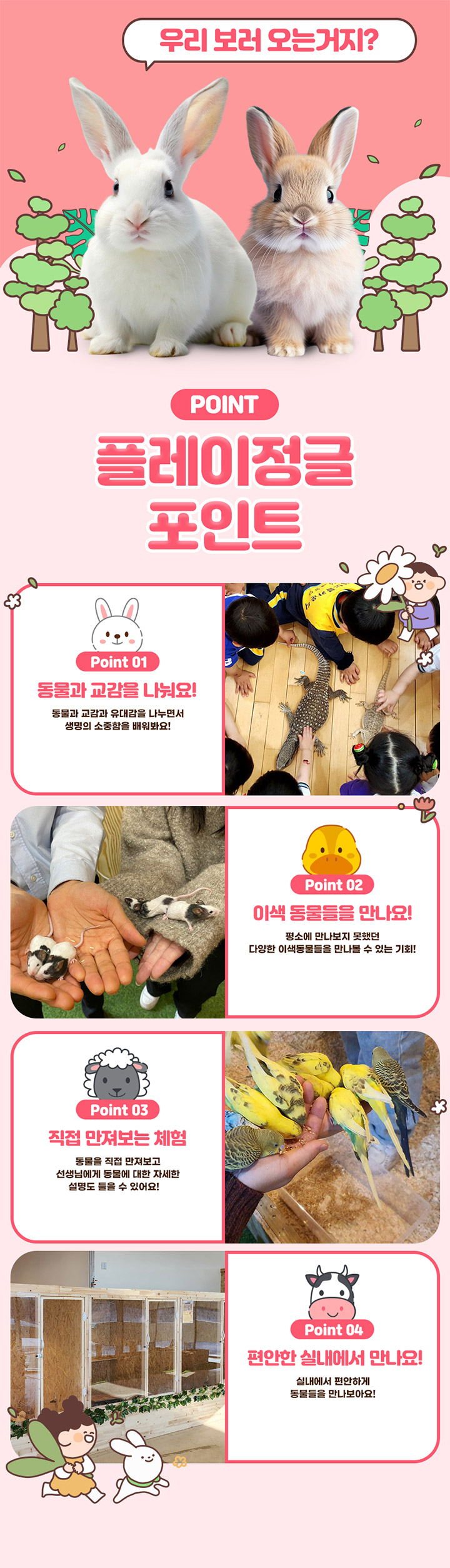 플레이정글은 체험형 실내동물원으로 평소에는 보기 힘든 70여 종의 다양한 동물들을 가까이에서 만나보고 먹이도 주며 교감할 수 있는 곳이에요. 동물선생님의 자세한 설명과 함께 동물에 대해 배우고 생명의 소중함을 느끼며 즐겁고 유익한 시간을 보내보세요.