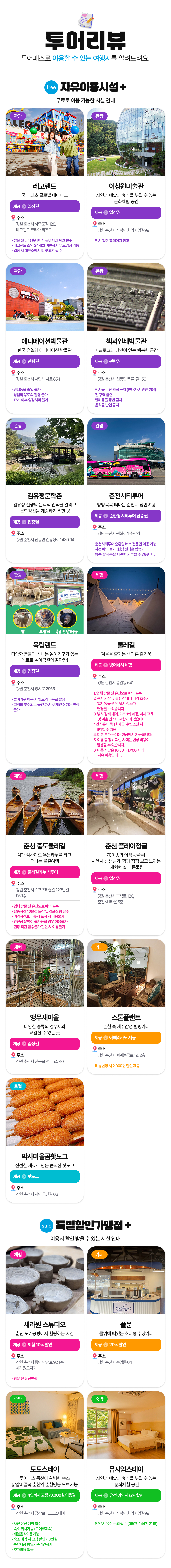 춘천 여행의 필수템! 춘천 투어패스와 함께 즐거운 시간을 보내보세요. 투어패스 하나면 유명 카페와 미술관부터 박물관까지 이용할 수 있어요. 춘천투어패스와 함께 합리적인 가격으로 48시간동안 알찬 여행을 즐겨 보세요!