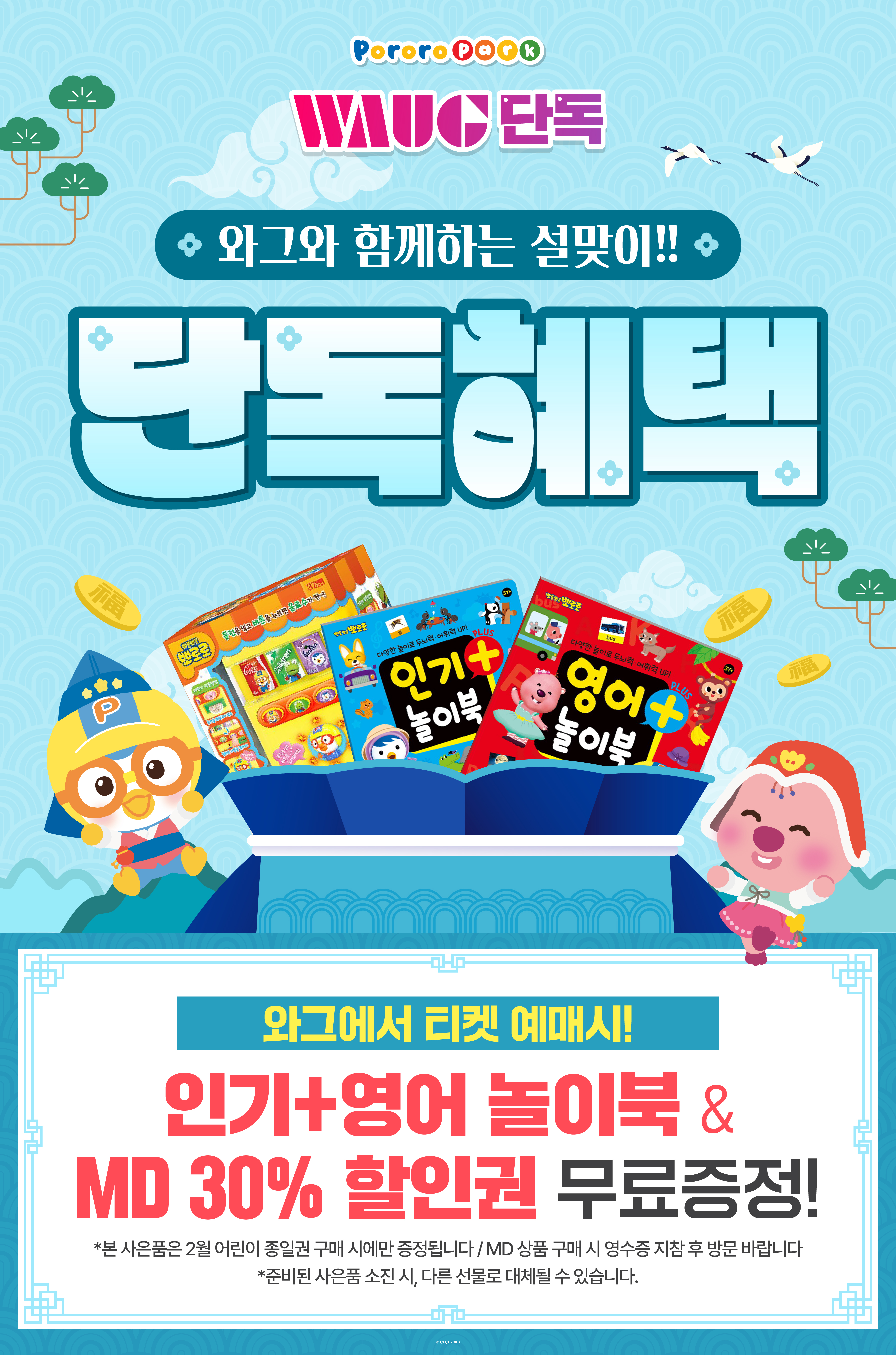 한국어 제공월미도에 4,200평 초대형 뽀로로앤타요 테마파크 등장! 특가로 귀여운 친구들과 하루종일 놀 수 있는 특별한 시간을 선물하세요! 💙🎈 오직 WAUG 구매고객에게만 드리는 단독혜택! 2월 어린이 종일권 구매 시, 인기+영어 놀이북 & MD 30% 할인권 증정됩니다 🎀🧃 (사은품 증정은 영수증 지참 후 매표소에 문의 바랍니다)