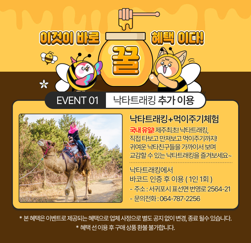 승마보다 높은 시야를 자랑하는 낙타를 타고 제주의 자연 속을 천천히 거닐며 힐링하는 시간까지, 패키지 이용권으로 모두 누려보세요.