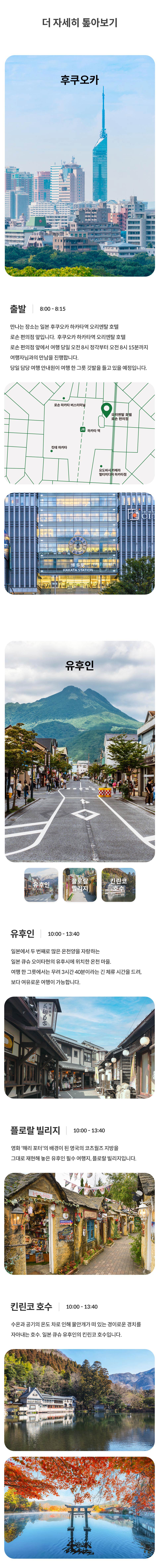 유후인, 유후다케, 벳푸까지 하루 만에 모두 돌아보는 여행 한 그릇의 큐슈 투어는 큐슈 지역을 여행하는 타사 상품에 비해 각 여행지에서 체류하는 시간이 가장 길어요! 그만큼 여유롭게 여행지를 돌아볼 수 있어요. 그뿐만 아니라 여행지에 대한 설명은 차량 내에서 마치고, 하차한 후에는 자유롭게 여행하는 상품이라 자유도 100% 보장!