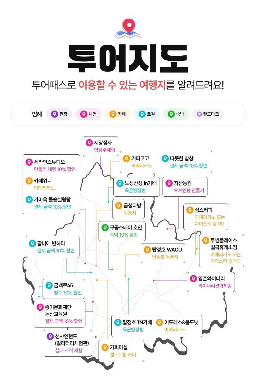 논산 투어패스는 24시간 동안 내가 원하는 제휴처를 무제한으로 이용할 수 있는 갓성비 있는 티켓으로 20여 곳의 무료 이용시설과 할인 혜택을 받을 수 있는 시설이 있어 논산의 다양한 관광지, 체험, 카페, 로컬 맛집 등을 내 마음대로 즐길 수 있어요. 또한 투어패스 바코드 티켓은 현재 나의 위치를 중심으로 이용할 수 있는 가까운 여행지도 추천해 주기 때문에 더욱 편리하게 여행을 즐길 수 있어 좋아요. 그럼 지금 바로 투어패스 티켓과 함께 논산을 알차게 즐겨보세요.