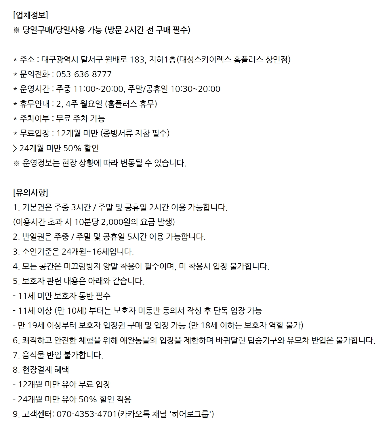 국내 최초 가족형 실내 놀이공원, 대형 키즈카페인 히어로플레이파크 대구 상인점이 5월 17일 신규 오픈했어요. 홈플러스 지하 1층에 위치해 있는 히어로플레이파크에는 아이들이 열광하는 카트레이싱존을 비롯해 닷지볼, 풋볼존 등 뛰어놀 수 있는 공간과 아이들의 도전정신을 키워줄 수 있는 챌린지 코스와 스윙코스터까지 다양한 놀이 시설들이 있어요. 더하여 부모님들이 프라이빗하게 쉴 수 있는 토굴룸, 그리고 간단한 요깃거리를 살 수 있는 카페테리아, 소중한 아이의 특별한 생일을 위한 파티룸까지 모든 것이 준비되어 있는 신상 키즈카페예요. 할인된 가격에 방문하여 아이들에게 행복한 하루를 선물해 보세요.