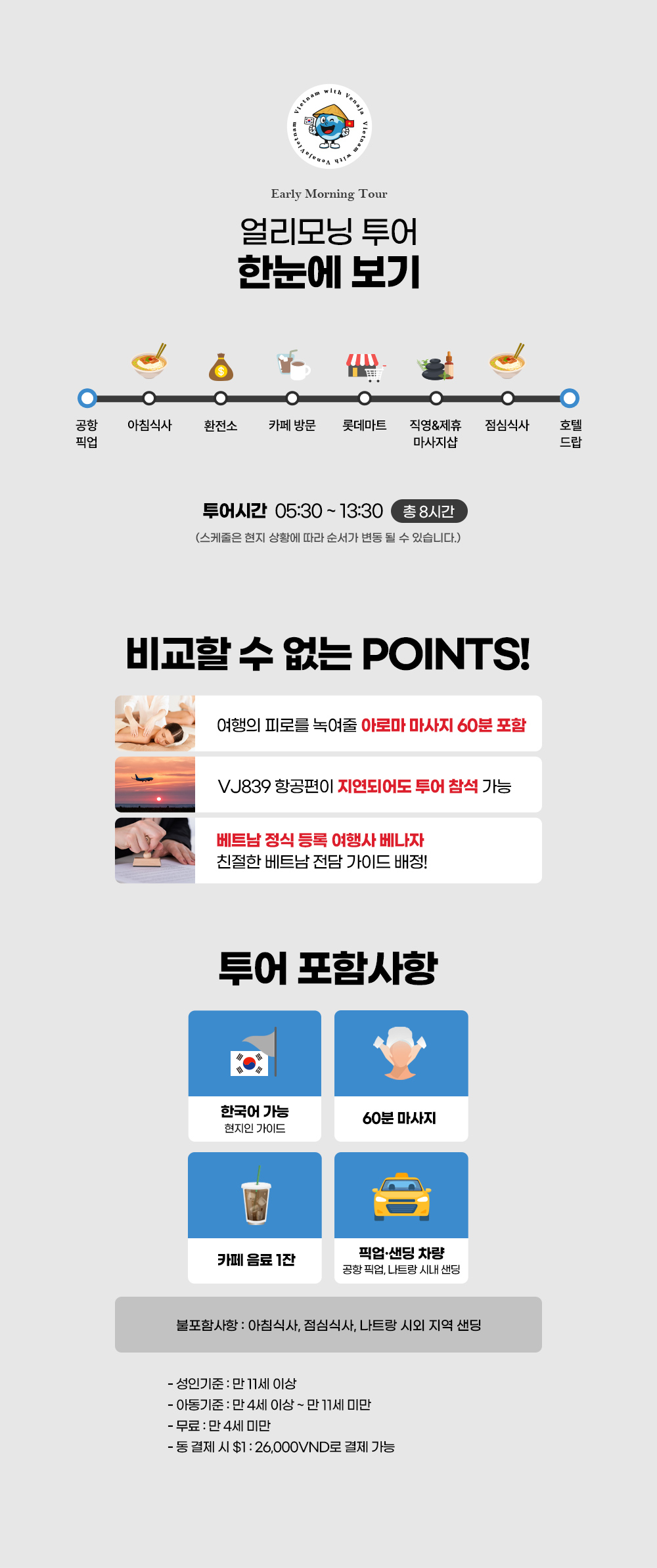 공항의 베나자 라운지에서 미팅 후 바로 출발해, 쌀국수로 배를 든든하게 채운 뒤 환전소, 콩카페, 롯데마트를 들르는 일정이에요. 모닝 투어가 종료되고 본격적으로 여행을 시작하실 여러분을 위해, 투어의 마지막에는 60분의 마사지 코스도 마련되어 있어요.