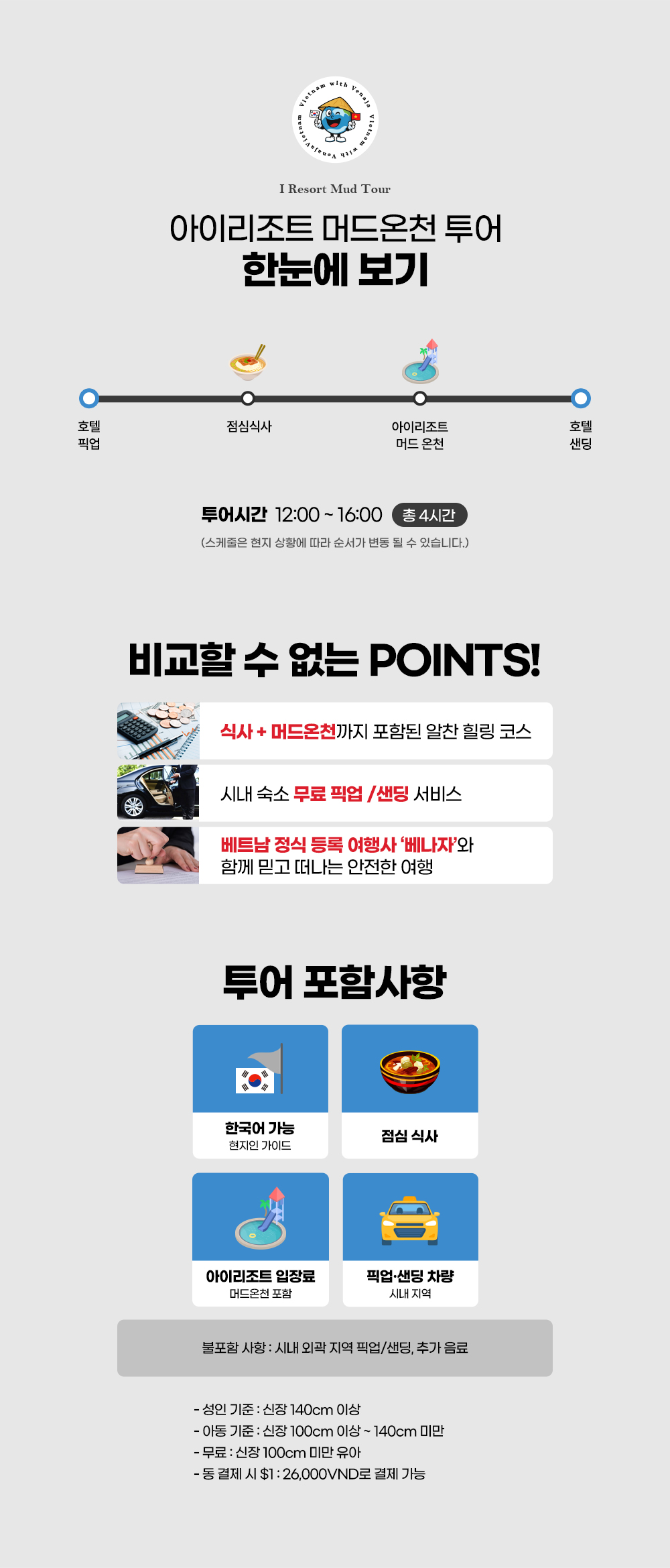 오후 12시쯤 여유롭게 출발해, 약 4시간 동안 아이리조트에서 짧고 굵은 힐링 타임을 즐겨보세요! 베트남 자유 여행 전문 투어사 '베나자'에서 진행하는 본 투어는, 피부 미용에 좋은 머드 온천과 아이리조트 워터파크를 모두 즐길 수 있는 상품이에요.