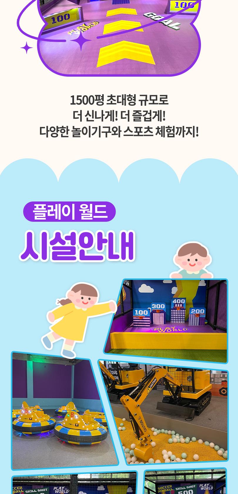 1500평 규모의 초대형 키즈 테마파크, 플레이월드 파주점을 소개합니다! 플레이월드 파주점에는 다양한 놀이기구는 물론, 스포츠 체험까지 준비되어 있어 아이들이 마음껏 뛰어놀며 즐거운 하루를 보낼 수 있어요. 쾌적하고 넓은 신규 시설에서 위생 걱정 없이 마음 놓고 아이들에게 즐거운 추억을 선물해 보세요.