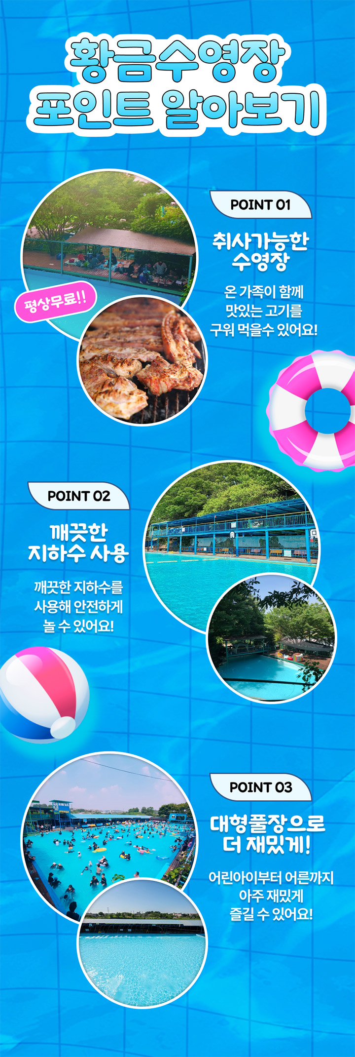 황금수영장은 취사가 가능한 야외수영장이라 깨끗하고 시원한 물에서 물놀이를 즐기며 삼겹살, 라면 등 맛있는 음식도 먹을 수 있어요. 돗자리를 지참해도 되고 평상도 무료로 제공되니 편안하고 즐거운 하루를 보내보세요.