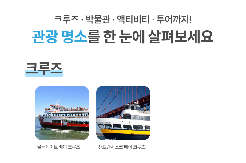 샌프란시스코 빅패스는 샌프란시스코의 명소 탑 8을 자유롭게 방문하는 패스로 최대 40%의 할인을 받을 수 있어요. 샌프란시스코를 대표하는 금문교부터 크루즈, 박물관, 투어, 액티비티까지! 빅패스와 함께 가격의 부담은 줄이고, 여행 장소는 늘리면서 알차고 즐거운 샌프란시스코 여행을 해 보세요! 빅패스와 함께 주요 명소를 내가 원하는 시간에 자유롭게 방문하며 즐거운 여행을 만들어 보세요!
