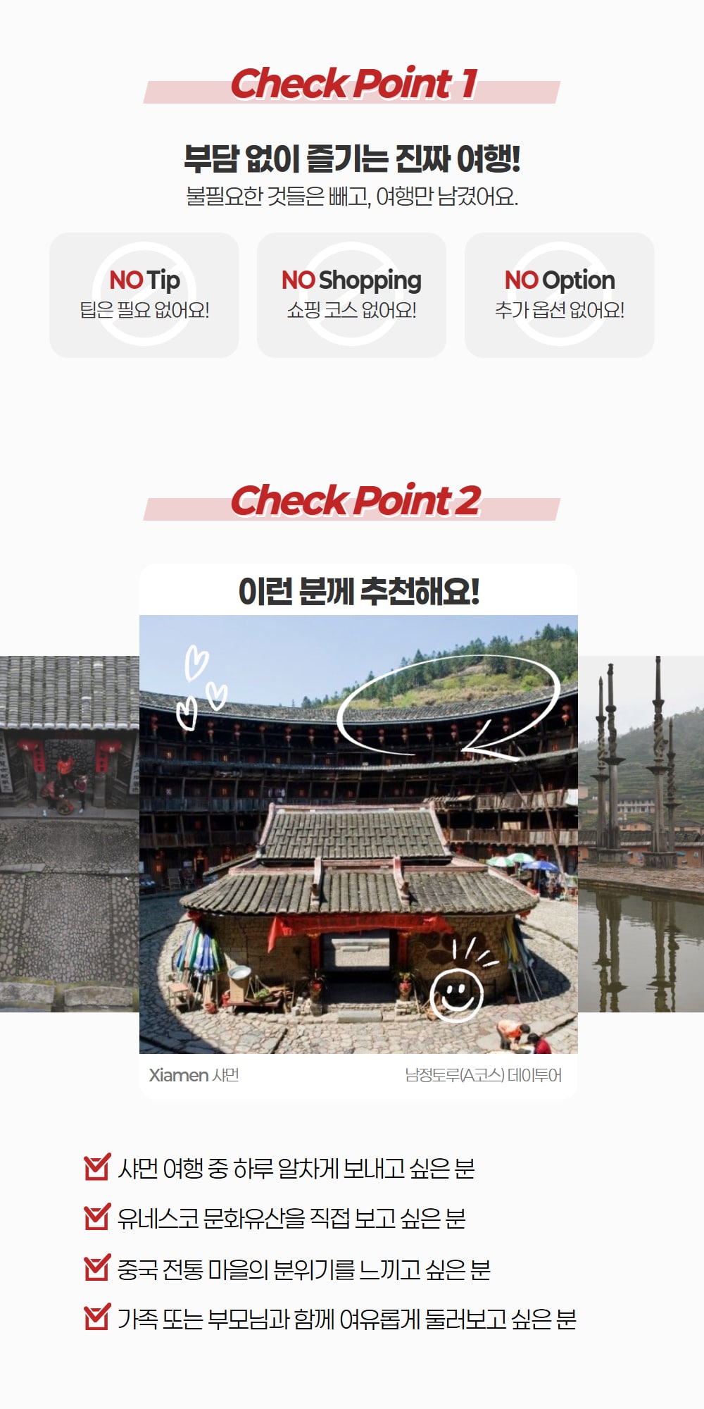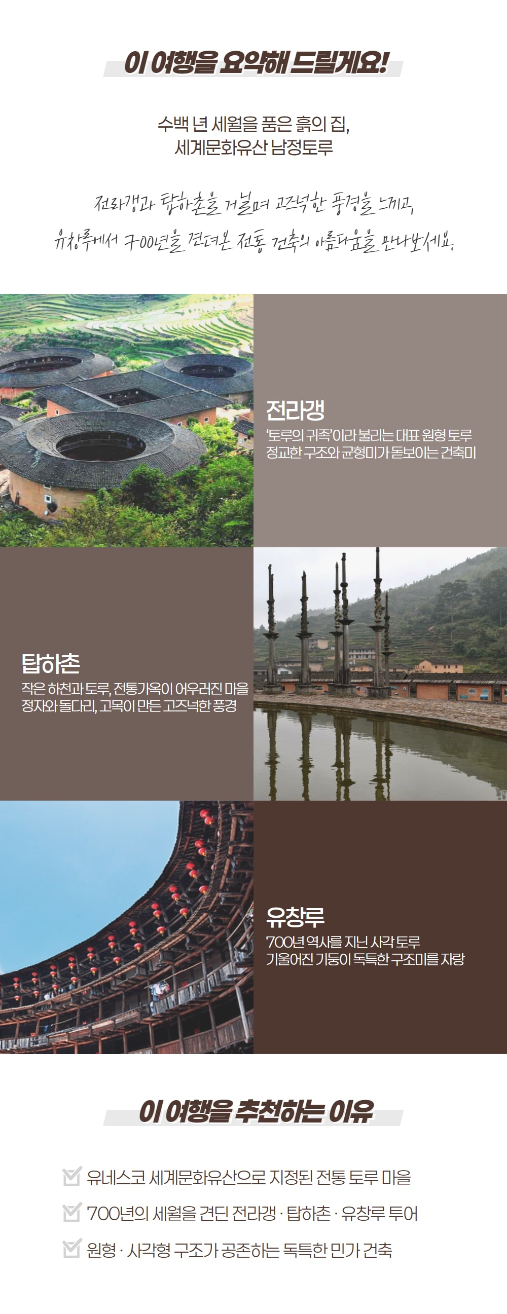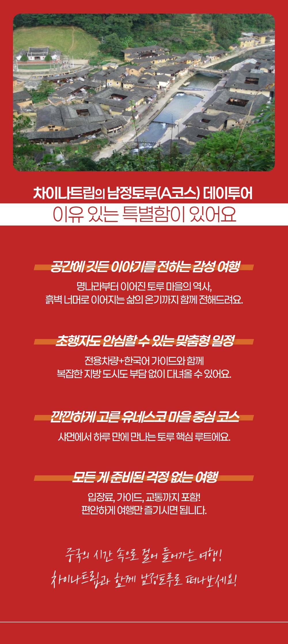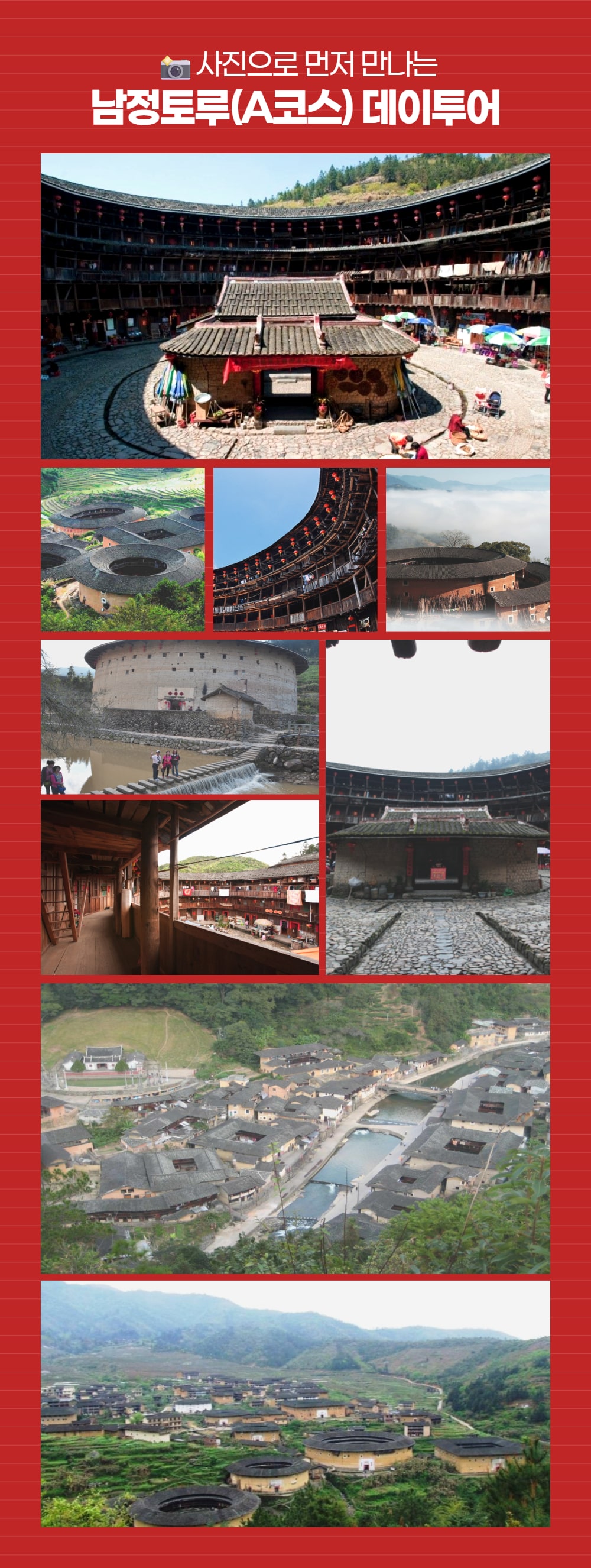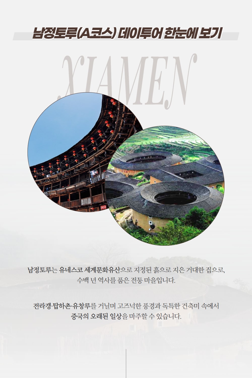 샤먼에서 여행 중이라면 한 번쯤 꼭 가봐야 할 남정토루 투어 상품을 소개해요! 아시아 특유의 씨족 문화를 기반으로, 독특한 형태로 지어져 세계문화유산에 등록된 남정토루를 하루 동안 둘러볼 수 있어요.