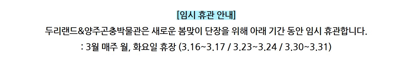 한국어 제공아이들에게 살아있는 자연을 보여주고 생명의 소중함을 느끼게 해주고 싶으시다면 두리랜드의 양주곤충박물관에 방문해 보세요.