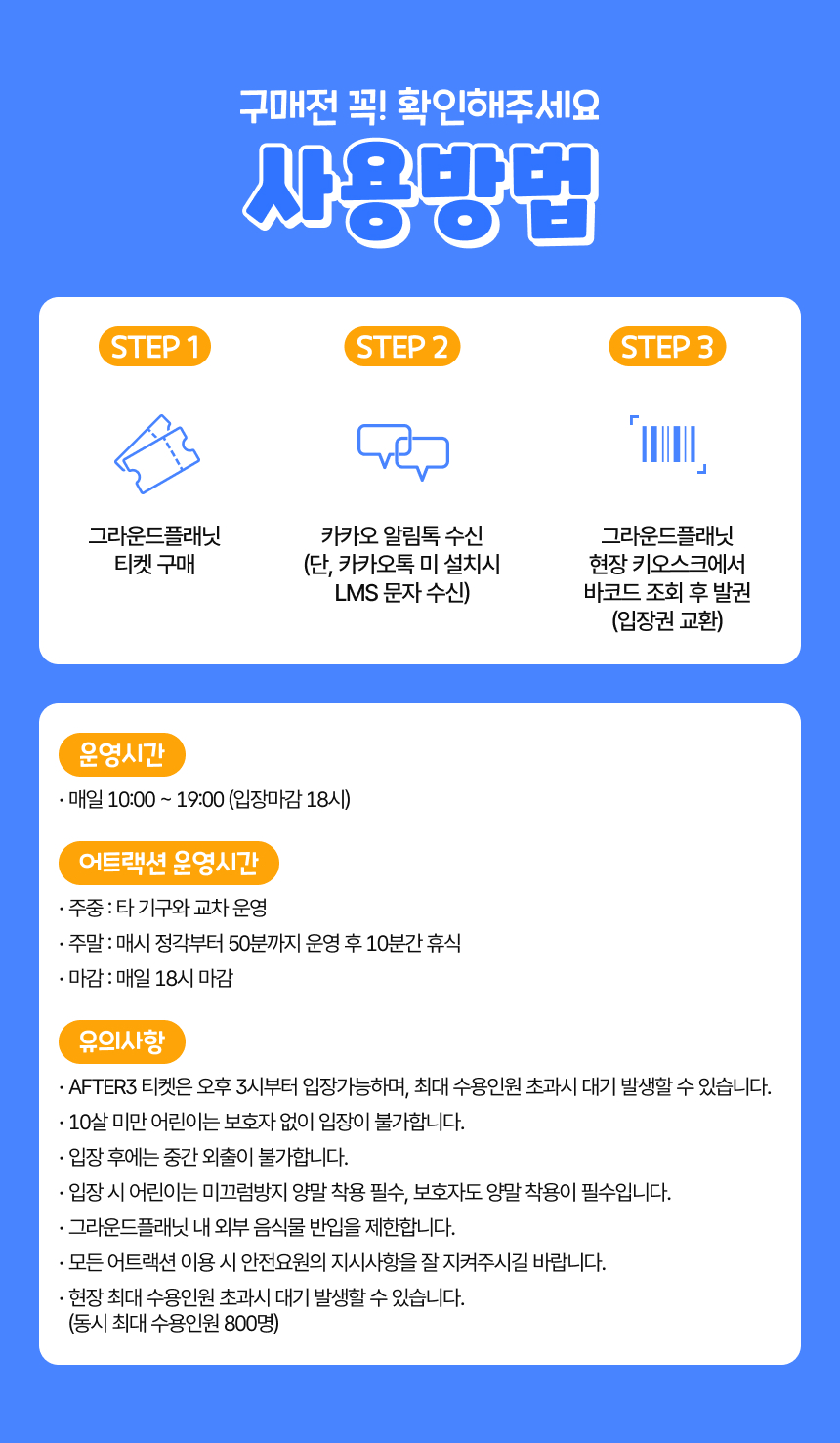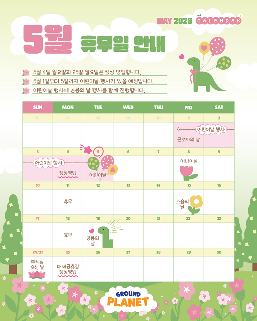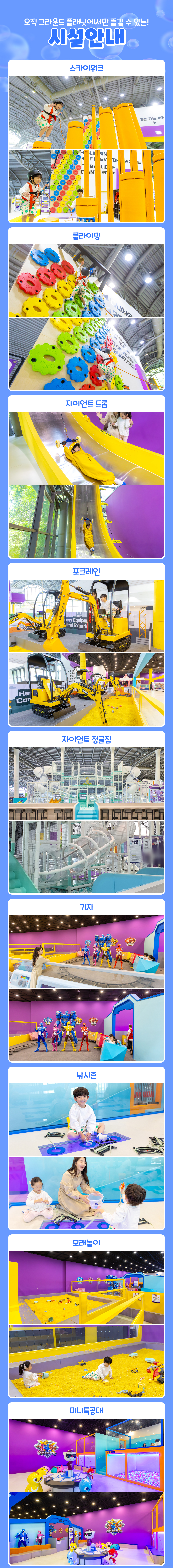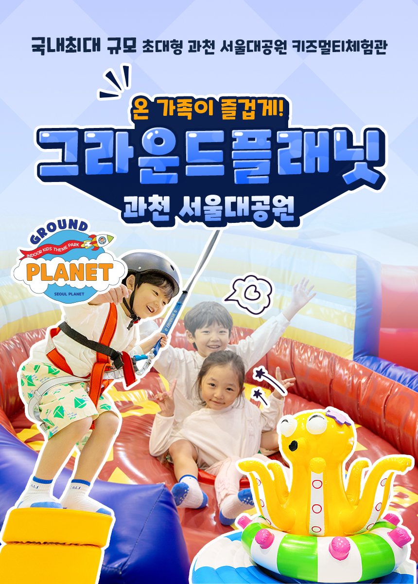 과천 서울대공원 내에 위치한 한국 최대 규모의 키즈 멀티 체험관, 그라운드플래닛을 소개해요! 넓은 키즈카페 내에는 클라이밍을 비롯한 스포츠 시설부터 직접 운전하는 범퍼카와 미니 포크레인, 대형 미끄럼틀과 볼풀장, 튜브 썰매 등 온몸으로 신나게 뛰어놀 수 있는 시설은 물론, 섬세한 장난감과 캐릭터까지 아이들이 좋아하는 것들이 모두 모여 있어 시간 가는 줄 모르고 놀이에 빠지는 하루가 될 거예요. 한계 없는 즐거움의 세상, 그라운드플래닛으로 함께 떠나볼까요?