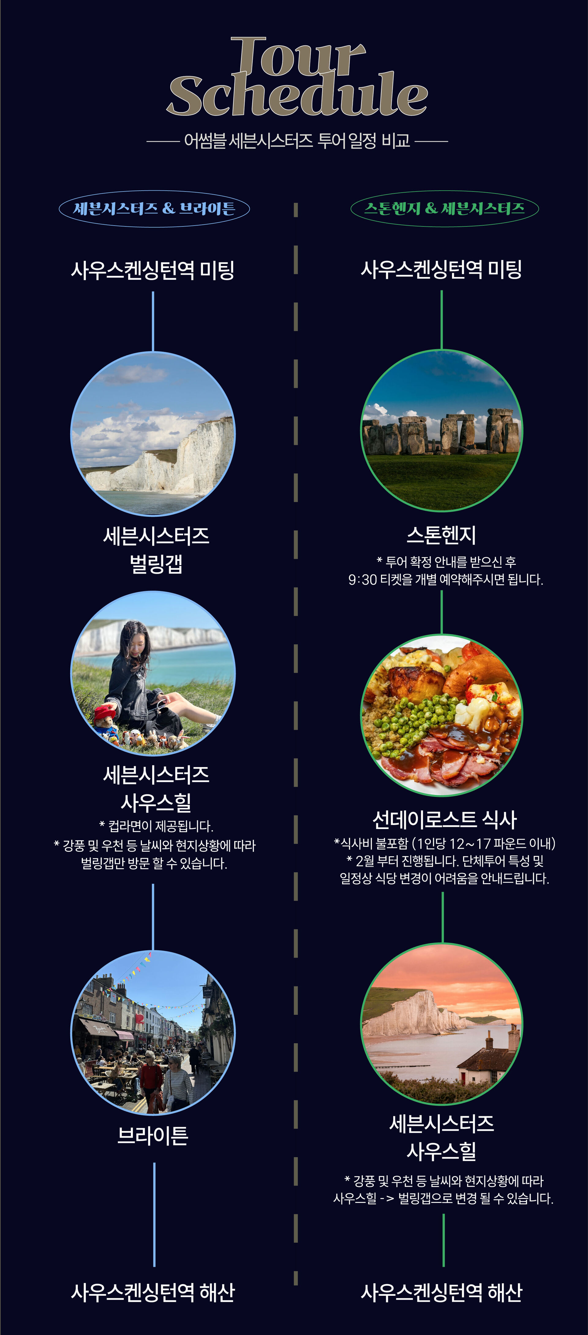 한국어 제공푸르른 바다와 장엄한 자연을 한 번에 즐기고 싶으신 분들께 어썸블의 세븐 시스터즈 & 브라이튼 투어를 추천해요. 죽기 전 꼭 가야 할 101 곳에 선정된 세븐 시스터즈와 영국의 휴양 도시 브라이튼을 여행하며 멋진 바닷가 풍경과 함께 자유로운 영국의 감성을 느껴보세요. 세븐 시스터즈에서는 눈부시게 하얀 절벽과 푸른 바다가 어우러진 장엄한 자연 경관을 감상할 수 있어요. 그 후 방문할 브라이튼은 영국에서 가장 자유로운 분위기의 도시 중 하나로, 다채롭고 활기찬 문화를 경험할 수 있답니다. 전문 가이드님의 재밌는 설명과 함께 아름다운 영국 바닷가에서 잊지 못할 추억들을 만들어 보세요!