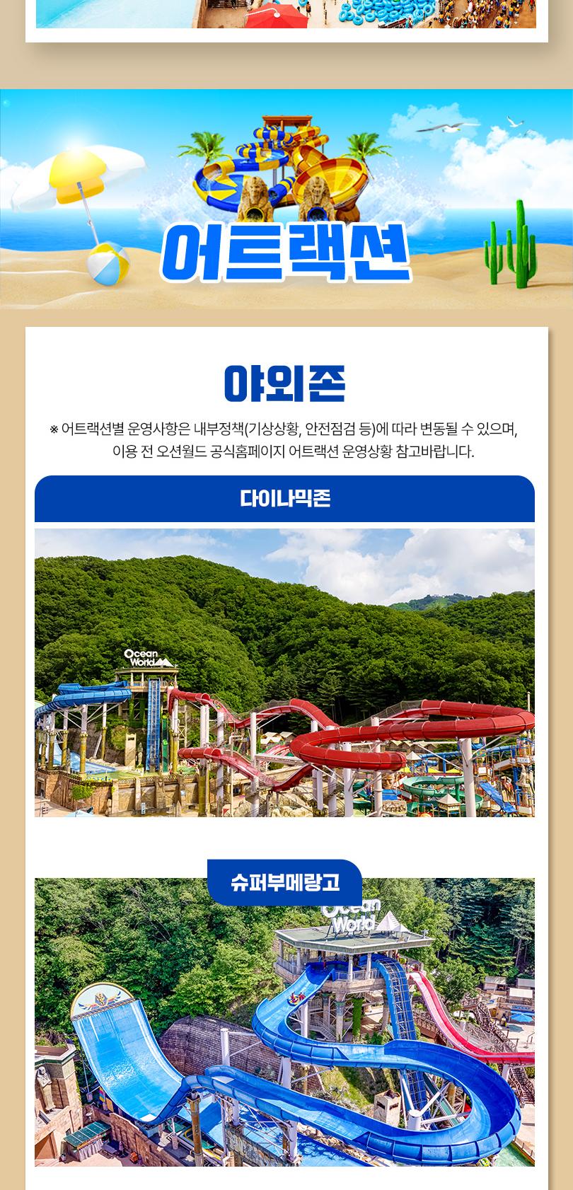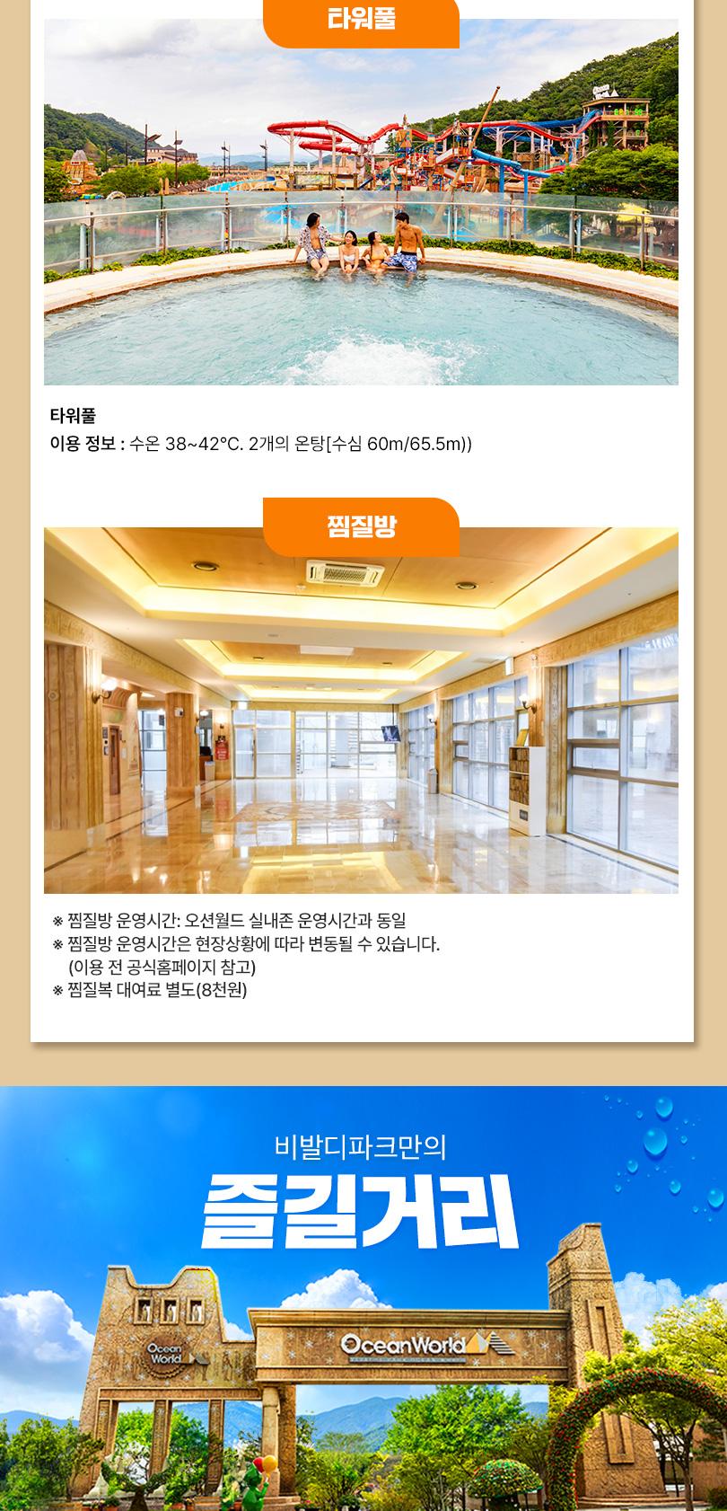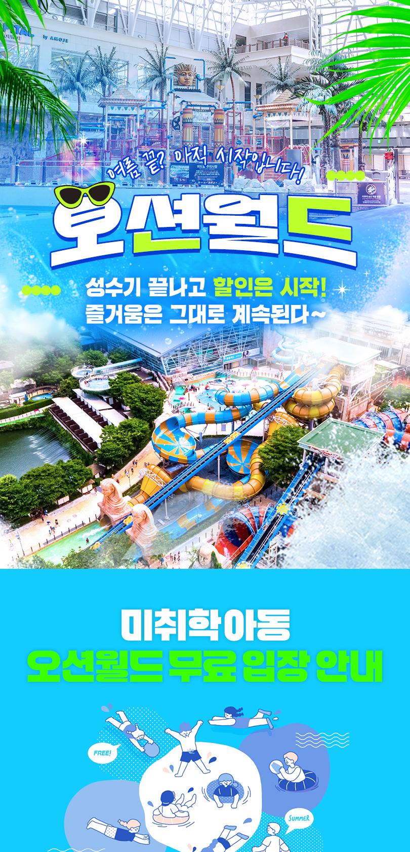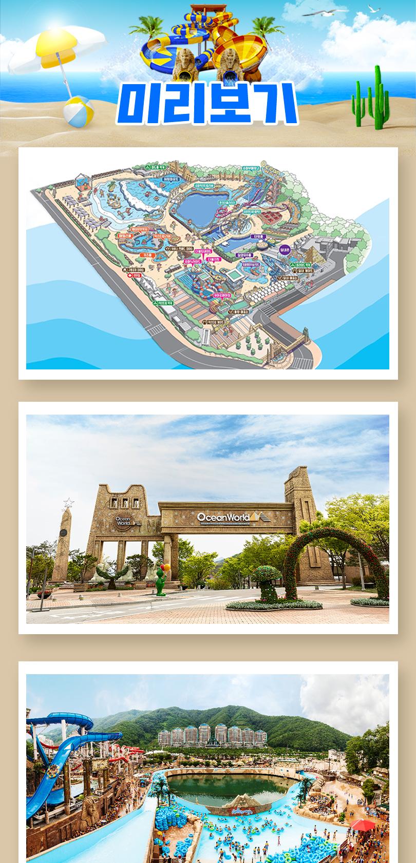 서울에서 약 1시간! 다양한 어트랙션과 사계절 힐링 스파존이 마련되어 있는 오션월드로 떠나보세요! 수상 안전 라이프가드가 항시 안전 감시 및 예방하고 있어 안심하고 즐길 수 있어요. 워터파크 외에도 찜질방, 관광 곤돌라 등 다양한 즐길 거리가 주변에 있어요. 이번 주, 오션월드에서 잊지 못할 추억을 만들어 봐요!