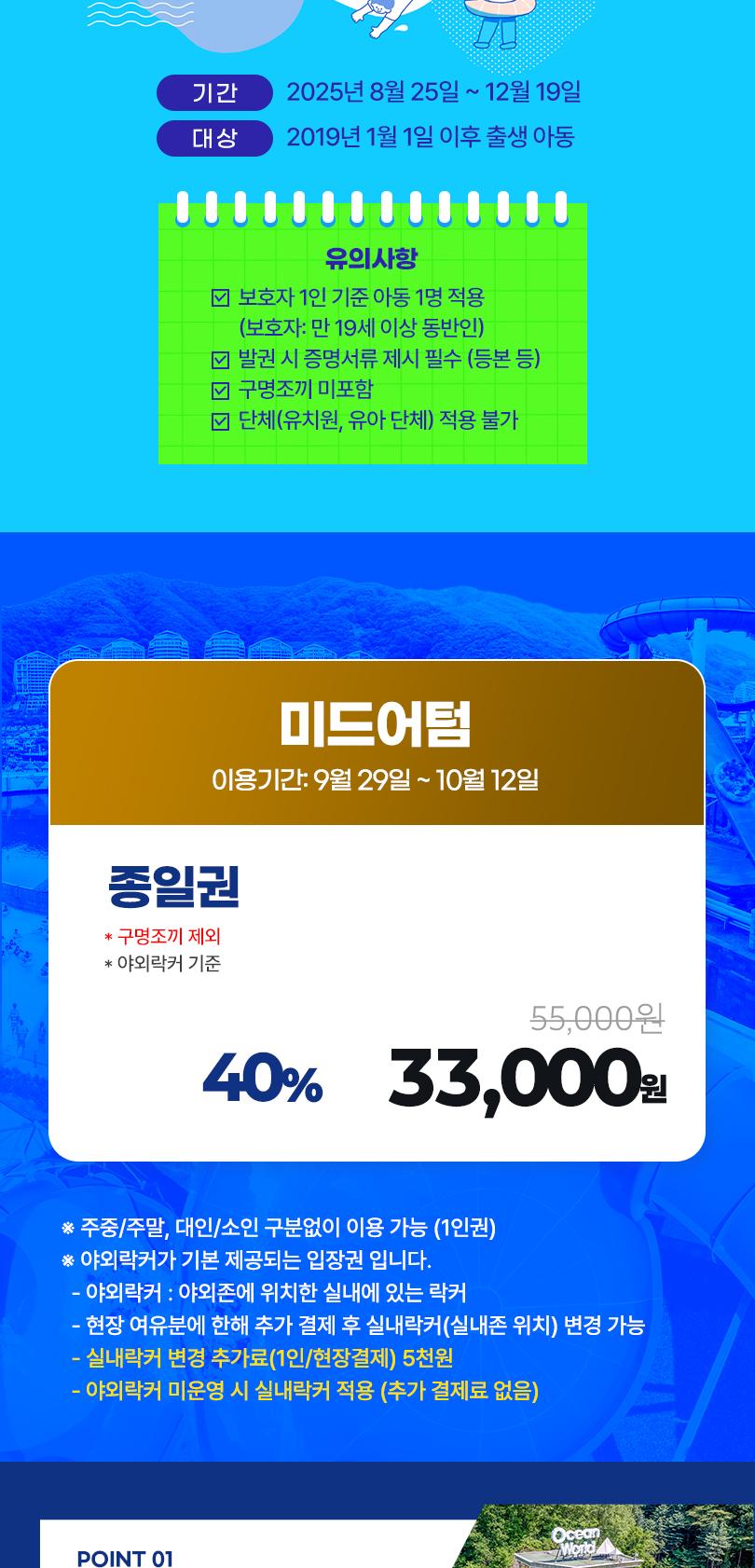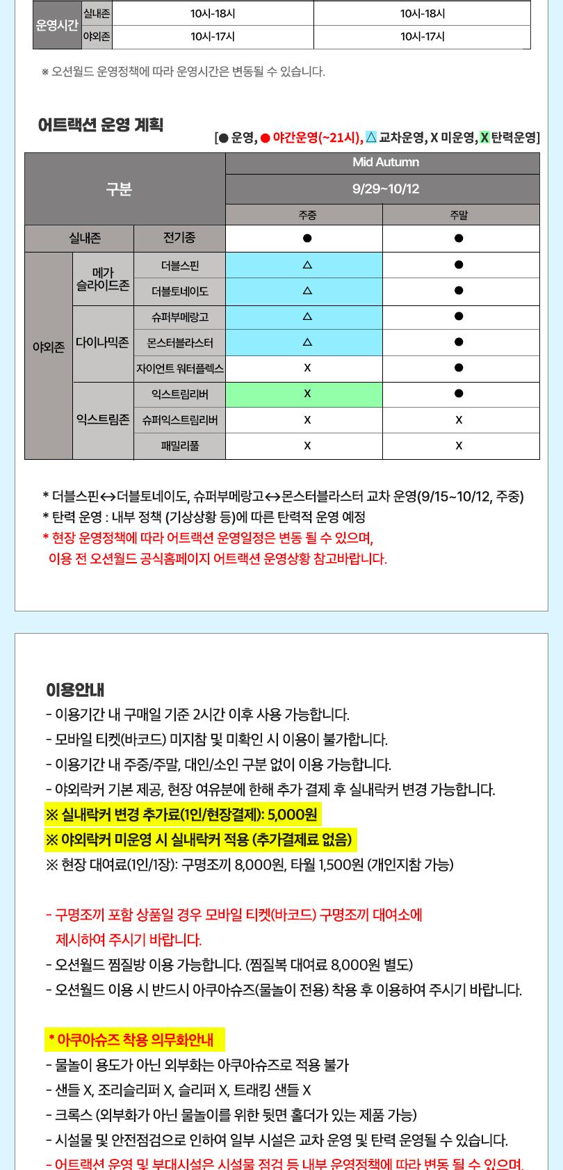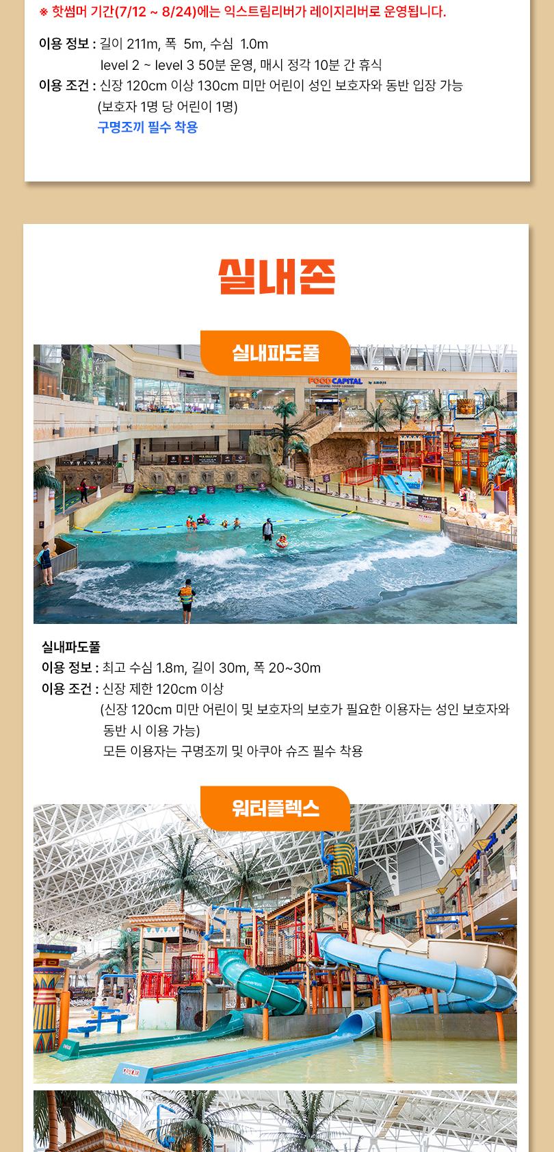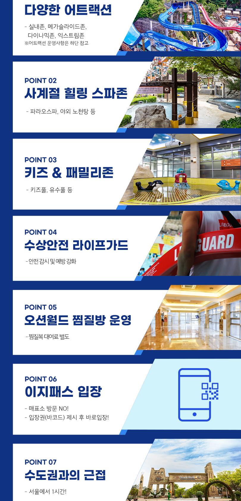 서울에서 약 1시간! 다양한 어트랙션과 사계절 힐링 스파존이 마련되어 있는 오션월드로 떠나보세요! 수상 안전 라이프가드가 항시 안전 감시 및 예방하고 있어 안심하고 즐길 수 있어요. 워터파크 외에도 찜질방, 관광 곤돌라 등 다양한 즐길 거리가 주변에 있어요. 이번 주, 오션월드에서 잊지 못할 추억을 만들어 봐요!