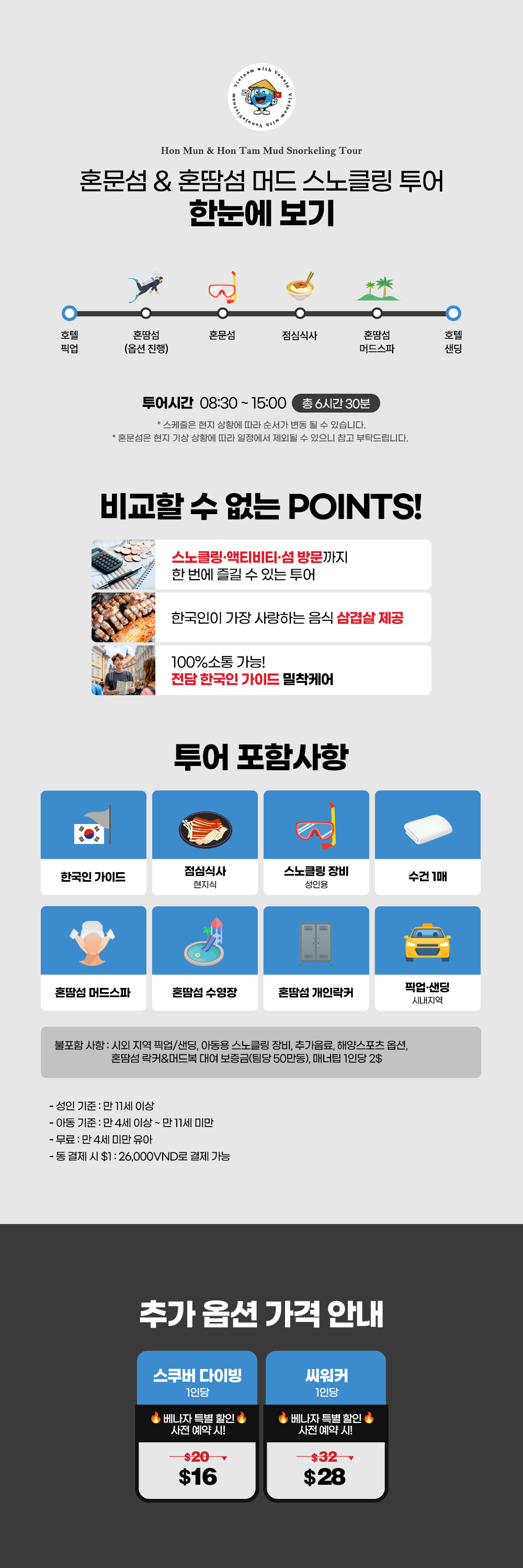 베스트혼땀머드스파와 스노쿨링을 한 번에 즐길 수 있어 만족했습니다. 나트랑은 즐길거리가 많아 이렇게 효율적인 상품 좋았어요~! 혼땀리조트는 숙박할까 고민했던 숙소였던만큼 머드투어하면서 살짝 분위기를 엿볼 수 있기에 아쉬움을 달랠 수 있었어요. 혼문섬에서는 물고기를 많이 봤어요. 아쉬웠던 점은 중간에 보트 바꿔타느라고 스킨스쿠버하는 곳에서 10분 정도 기다려야해서 불편하기도했고 시간도 아까웠어요. 점심식사는 일행끼리가 아닌 모르는 사람들과 쉐어해야하는 곳입니다. 저희는 백인가족과 함께했는데 현지식이 별로였는지 백인가족은 한 입 먹고 손도 안대는 분위기였는데 저희 아이가 맛있게 먹으니 신기한 듯 보는데 좀 민망했습니다. 사소한 부분 빼고 전체적인 진행은 만족합니다.