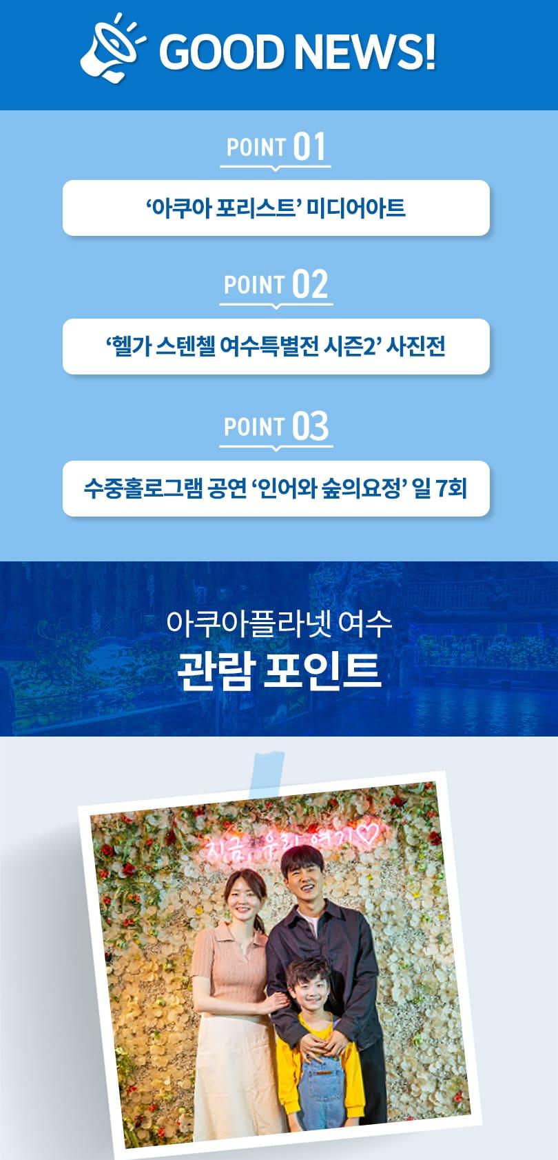 아쿠아플라넷 여수에서는 더욱 다채로운 볼거리와 체험을 제공하는 리뉴얼된 아쿠아플라넷에서 다양한 해양 동물을 만나보고 귀여운 상상력을 엿볼 수 있는 헬가스텐첼 사진전까지 즐길 수 있어요. 여수해상케이블카는 바다를 날아 섬과 육지를 연결하는 최초의 해상케이블카로 예로부터 아름답기로 유명한 한려해상 다도해를 파노라마 뷰로 감상할 수 있으니 즐거운 추억을 만들어 보세요.