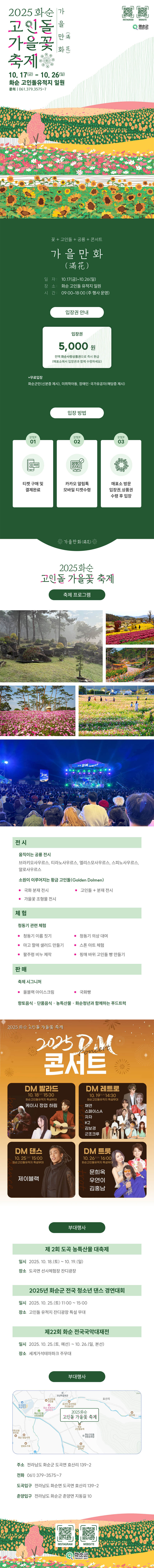 화순 고인돌 가을꽃 축제는 유네스코 세계유산인 화순 고인돌 유적지를 배경으로 펼쳐지는 색다른 가을 축제로 코스모스, 국화, 해바라기 등 흐드러지게 피어난 가을꽃들의 아름다움을 느낄 수 있을 뿐만 아니라 다양한 공연과 전시, 체험, 부대행사 등을 함께 즐길 수 있어요. 입장료는 지류입장권 교환 시 전액 화순사랑상품권으로 환급 받아 화순에서 사용할 수 있답니다. 주말에는 콘서트도 함께 즐길 수 있으니 가을 감성 가득한 축제에서 즐거운 시간을 보내보세요.