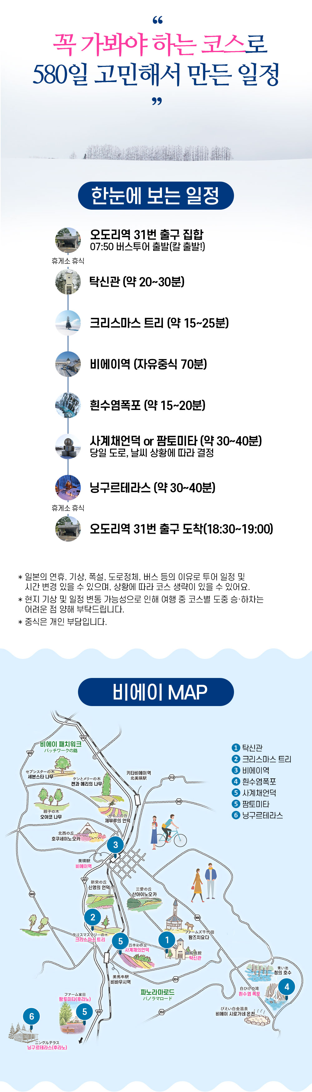 이번 투어는 후라노와 비에이에서 꼭 가봐야 할 스팟만 엄선했어요! 홋카이도의 아름다움을 남길 수 있는 탁신관 갤러리, 크리스마스 트리와 흰수염 폭포, 그리고 시즌 별로 방문하게 되는 사계채의 언덕과 팜도미타까지!